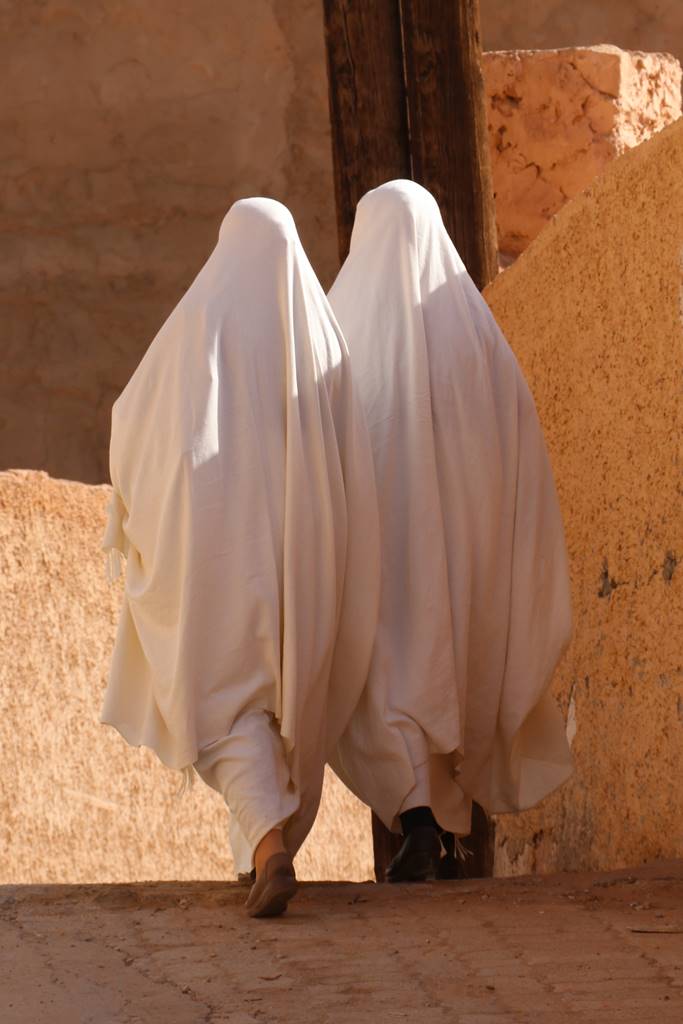 Les femmes mozabites sont entièrement dissimulées par de longs voiles blancs. Lorsqu’elles sont mariées, elles ne dévoilent qu’un oeil. Lorsqu’elles sont célibataires, les deux yeux sont apparents pour qu’elles puissent trouver un mari. Dans la ville sainte de Beni Izguen, j’ai du porter une longue tunique en coton très légère pour visiter la casbah. Le voile intégral est interdit dans les institutions publiques en Algérie depuis 2018.