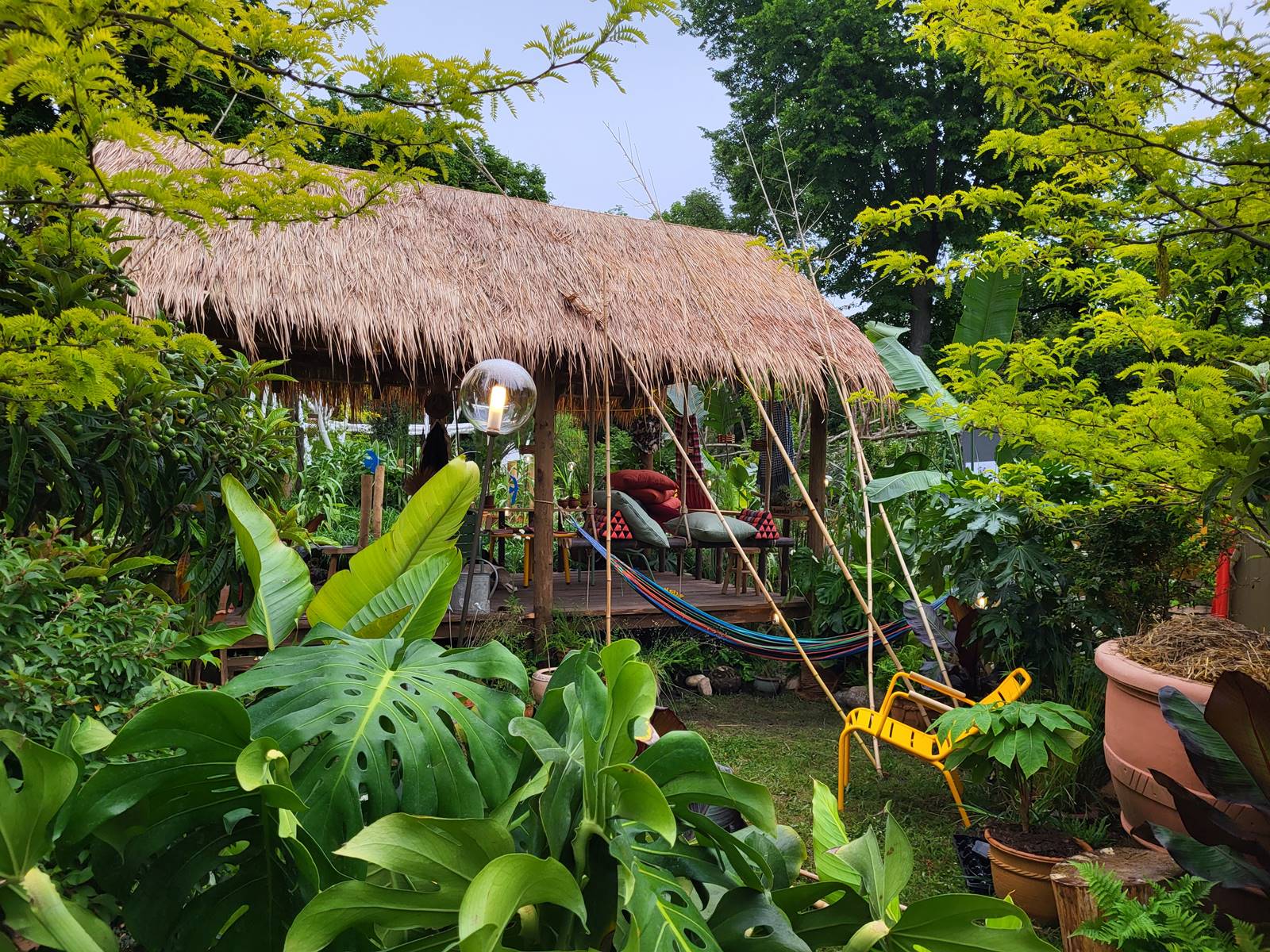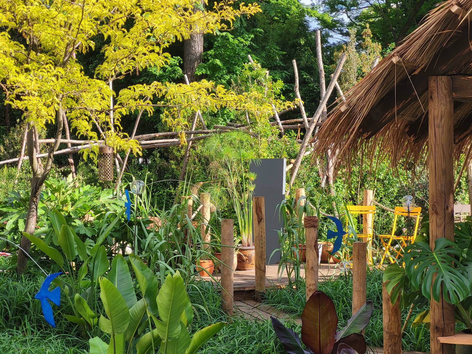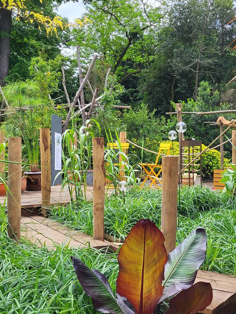 En 2024, lors de la 20ème édition de ‘Jardins Jardin’, Antoine de Lavalette a présenté sa vision des «natures cultivées» dans un jardin éphémère exotique baptisé «Mille après-midi d’été». On y pénètre par un escalier en bois pour rejoindre une cabane suspendue au-dessus d’un ruisseau. De l’autre côté, on découvre un jardin secret luxuriant avec des bananiers, des orchidées suspendues aux branches, des fougères et des oiseaux de paradis.