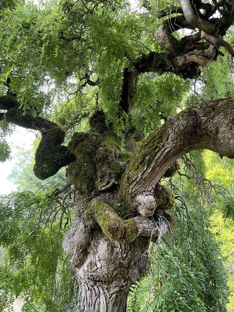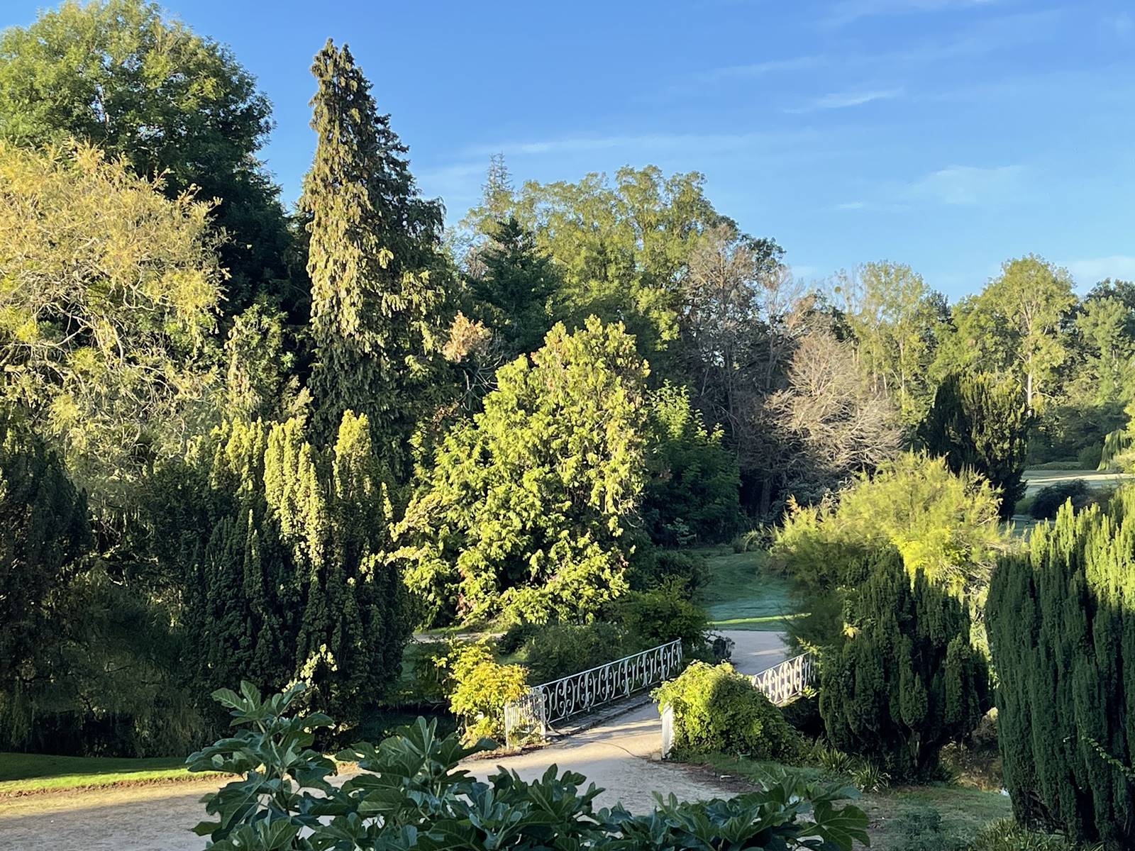 La grille d’entrée de l’Arboretum de Balaine s’ouvre sur une vaste pelouse traversée par une allée sinueuse de sorte que le château n’apparaît que peu à peu au détour d’une avancée boisée. Deux vénérables Sophora japonica ‘Pendula’ veillent sur les promeneurs comme des sentinelles à l’entrée de la cour d’honneur du château.
