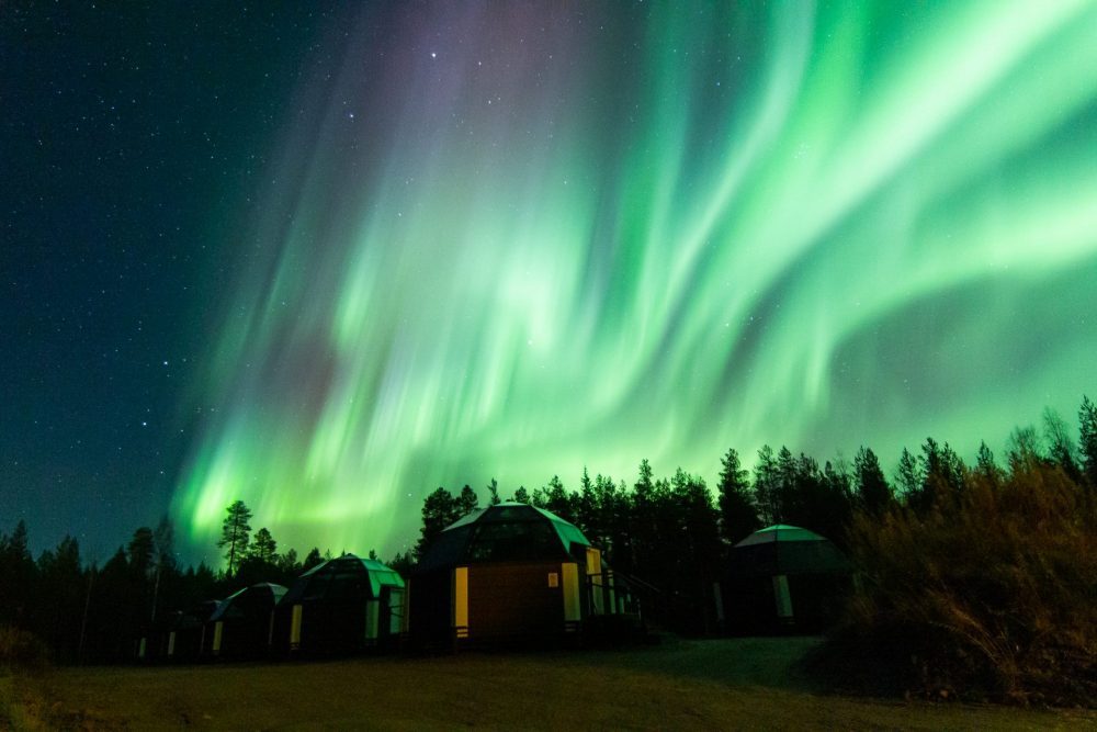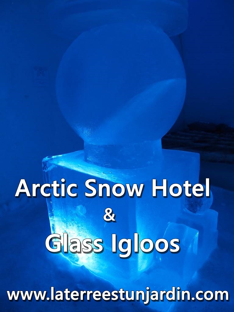 Une trentaine d’igloos de verre complètent l’offre hôtelière. Surmontées d’un toit de verre, ces petites maisons sont confortables et chauffées. Le vitres du toit de l’igloo sont chauffées ce qui fait fondre la neige et la glace du toit pour offrir durant la nuit une excellente vue sur la voûte céleste. La situation en pleine nature, loin de toute pollution lumineuse, permet d’admirer de son lit le ciel étoilé et avec un peu de chance les aurores boréales. Sur demande, un service d’alarme vous réveille lorsque les draperies mouvantes des aurores boréales sont visibles. C’est le must!