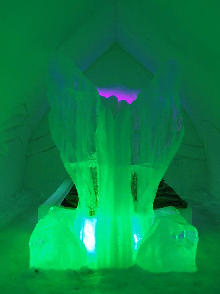 Imaginez une salle de restaurant où tout est en glace, du sol au plafond soutenu par des piliers de glace cristalline en passant par les tables, les bancs et même la vaisselle en forme de flocons de neige. Des fourrures de rennes recouvrent les banquettes de glace ce qui permet de s’asseoir sans se geler les fesses. Le service trois couverts est ultra rapide car on vient surtout ici pour l’expérience, mais pas question de traîner si on ne veut pas se transformer en glaçon!