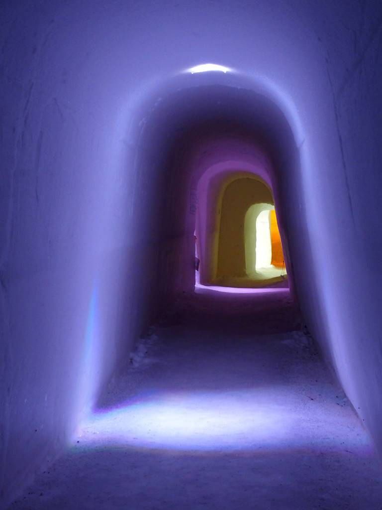 Il ne faut emporter dans la chambre que le nécessaire dont on a besoin durant la nuit. Pour le reste des bagages, il existe des vestiaires avec des casiers sécurisés. Il n’y a pas de fenêtres ni de portes aux chambres. Un simple rideau sépare la pièce du couloir couvert de glace, lui aussi. Le plus difficile est de sortir au milieu de la nuit pour se rendre aux sanitaires situés tout au bout du couloir. On fait attention de ne pas glisser sur le sol gelé.