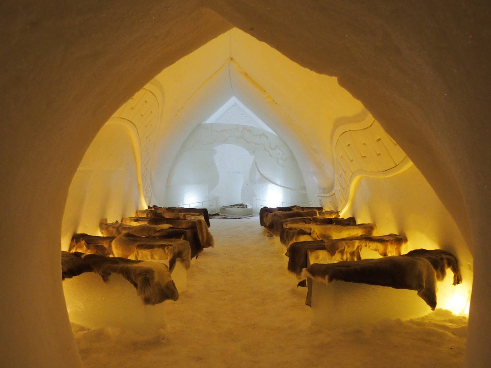 La température dans l’Arctic Snow Hotel est partout négative, à moins 5°C, même s’il fait parfois beaucoup plus froid dehors. Les murs immaculés faits de neige ou de glace absorbent les sons ce qui procure une étonnante sensation de calme et de sérénité. Une série de tunnels et de couloirs de glace mènent à différentes salles de glace, un bar, un restaurant, des saunas, une trentaine de chambres et même une chapelle pour se marier.
