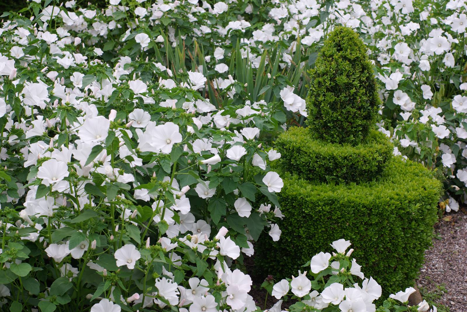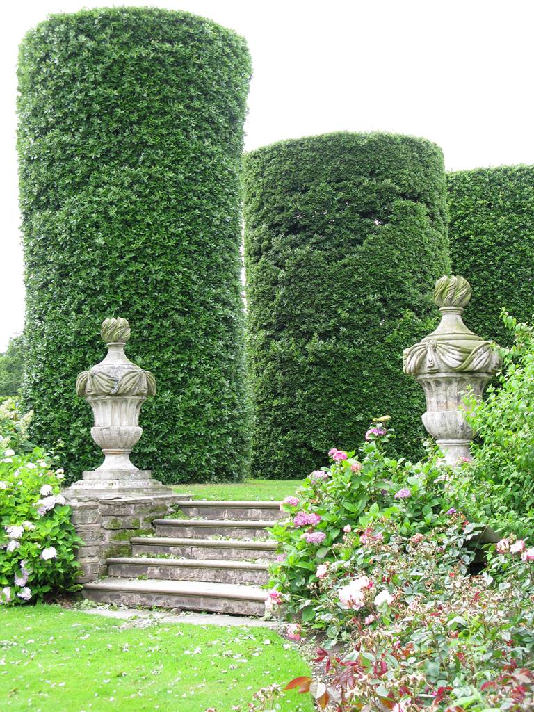 Les plates-bandes se détachent sur des topiaires d’ifs taillés en arcs-boutants qui créent des divisions très marquées. Une longue bande de gazon sépare les deux parterres de vivaces. «Elle remplace un sentier de gravier qui était plus difficile à entretenir de manière écologique» se souvient de la vicomtesse soucieuse d’écologie.