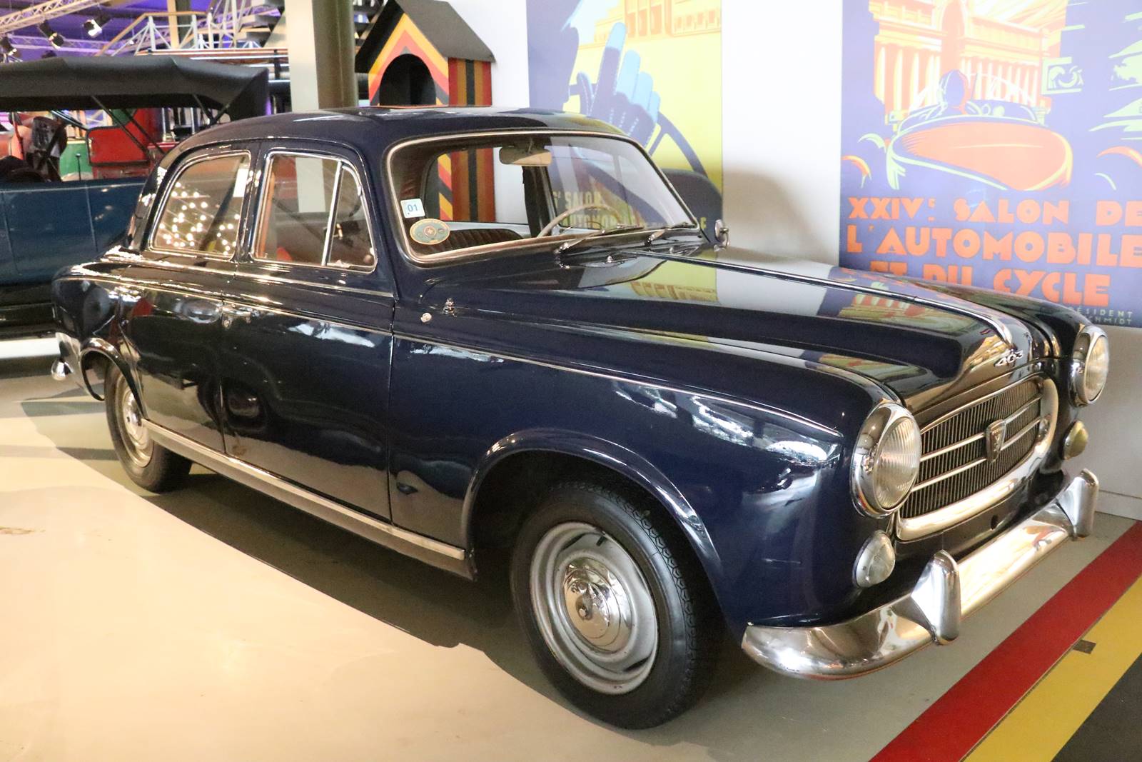 1955 Peugeot 403. Voiture de classe moyenne dessinée par Pininfarina, elle se distingue par son style ponton en trois volumes. Elle était proposée avec un toit ouvrant en métal.