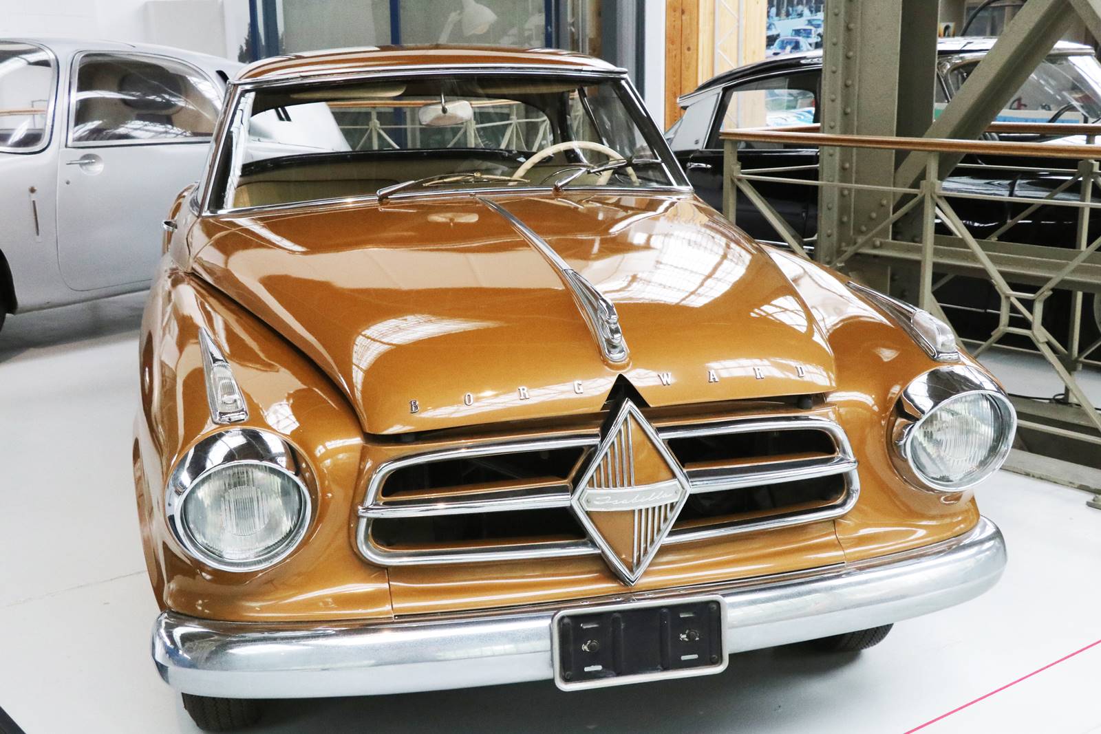 1957 Borgward Isabella Coupé. Créée un an avant la Citroën DS, cette belle voiture au style vieillot aux chromes rutilants semble venue du temps passé.
