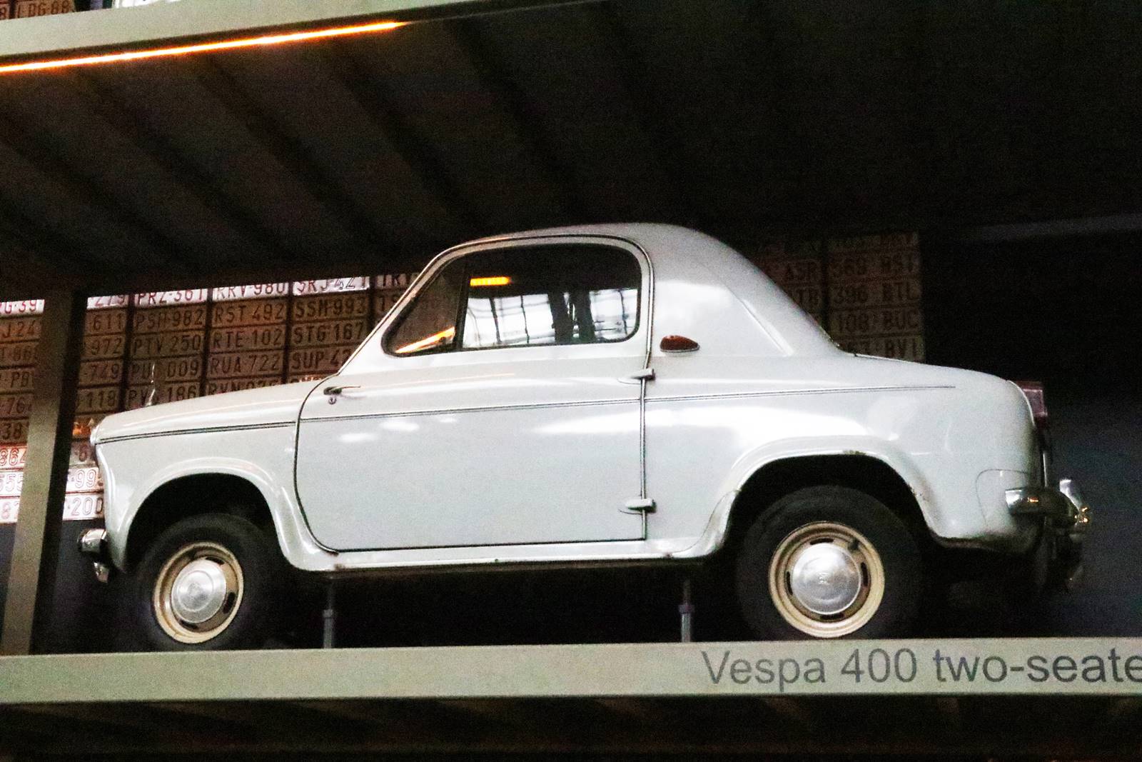 1957 Vespa 400. Développé par Piaggio, ce modèle était la citadine idéale, destinée à un public féminin. Le moteur est à l’arrière. A l’avant, il n’y a de place que pour la batterie 12V.