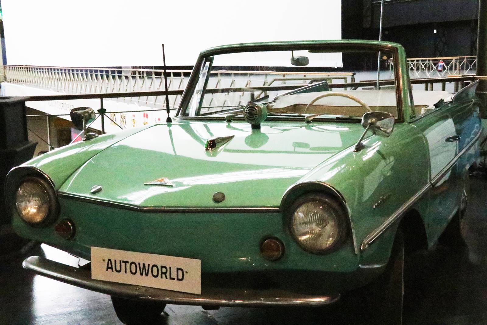 1965 Amphicar 770. C’est la plus célèbre des voitures particulières amphibie produite à 3.878 exemplaires. Deux hélices assurent la propulsion dans l’eau, les roues faisant office de gouvernail.