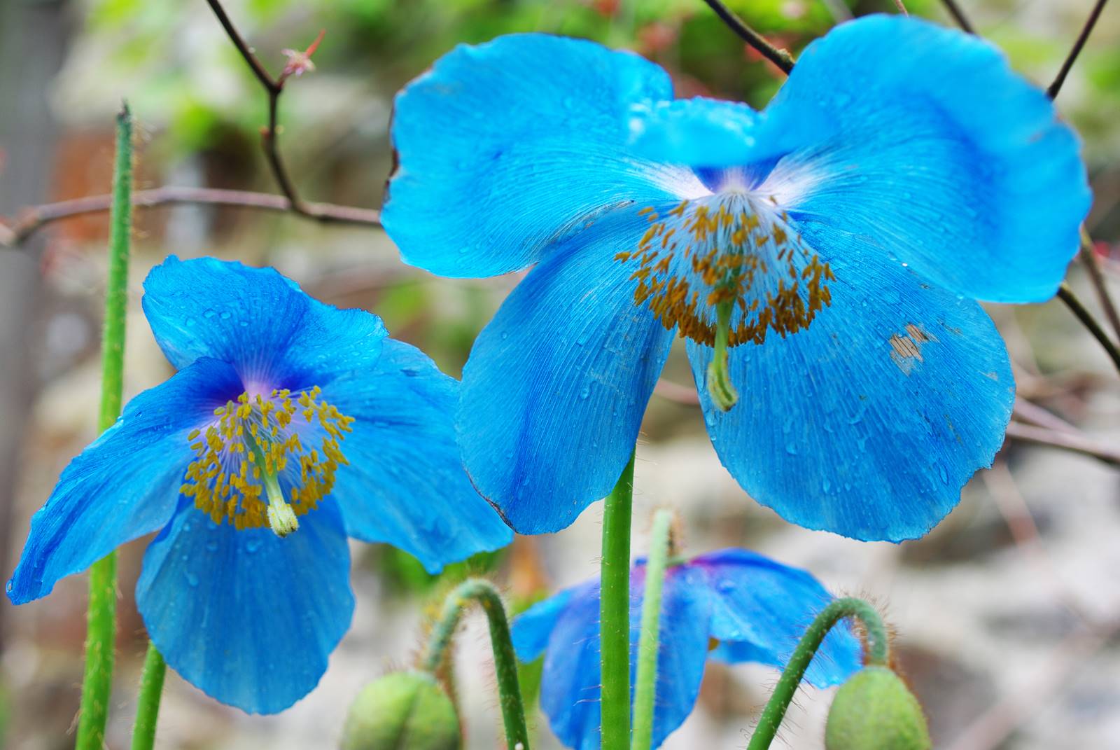 Le foisonnement de fleurs vivaces associe au printemps les euphorbes jaunes et oranges qui se mêlent aux boules bleues de l’ail d’ornement. Avec un pic de floraison en mai, le pavot de l’Himalaya, Meconopsis, déploie ses pétales bleu vif dans le jardin des coquelicots près du moulin et des primevères dans le jardin nord. (voir mes reportages sur les Euphorbes et l’Ail d’ornement)