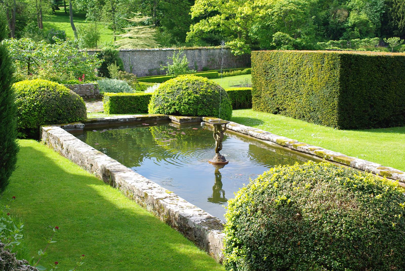 Les jardins qui s’étirent en terrasses offrent de nombreux points de vue. Une pièce d’eau anime une terrasse ensoleillée dominant une vaste roseraie formelle entourée de murs, un jardin de repos peuplé de néfliers et de mûriers, un jardin fruitier avec des d’arbres conduits en espalier et un potager fournissant à l’hôtel d’incroyables quantité de légumes et de fleurs à couper.