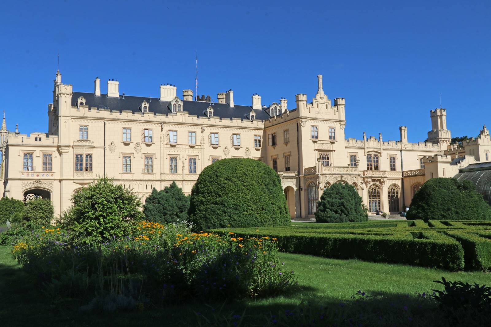 Le château de Lednice est entouré d‘un jardin formel à la française remanié à la fin du 19e siècle selon les plans de l’architecte Michelli. Le jardin aux tracés géométriques est orné de sculptures antiques, de fontaines, de buis taillés et boulingrins qui auraient pu être là deux siècles auparavant.