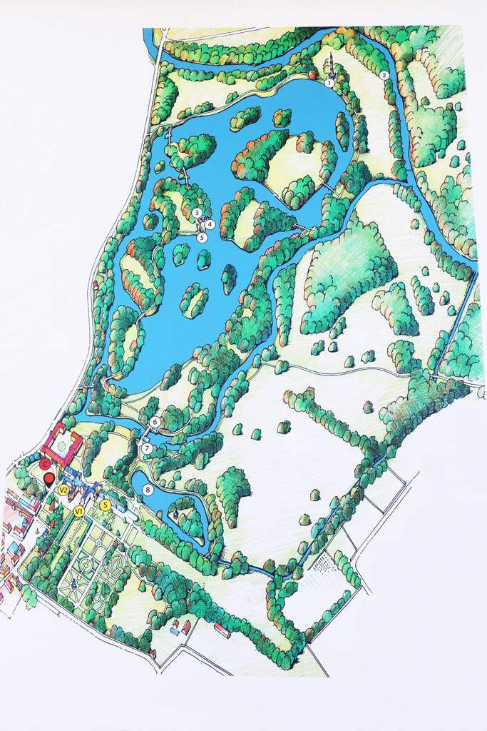 On se promène dans le parc à pied, à vélo, en calèche tirées par des chevaux ou en bateau sur ses plans d’eau.
