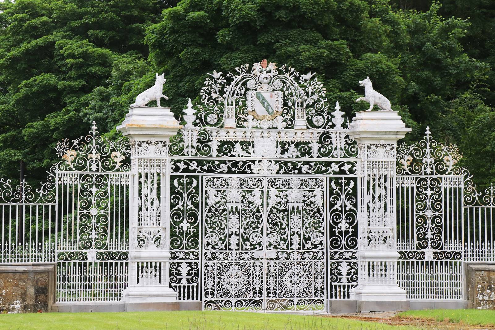 En 1719, l’avant cour du château est recouverte de gazon et les portes sont remplacées par un magnifique ensemble de grilles en forgé sorties des forges voisines de Bersham. Ce portail baroque réalisé par les frères Davies est aujourd’hui placé à l’entrée du parc. Il porte les armoiries de la famille Myddelton avec une main rouge sanglante, trois têtes de loups et une tête d’aigle.
