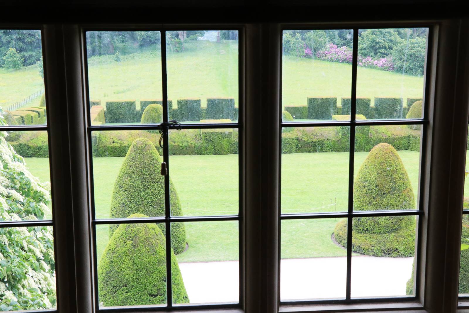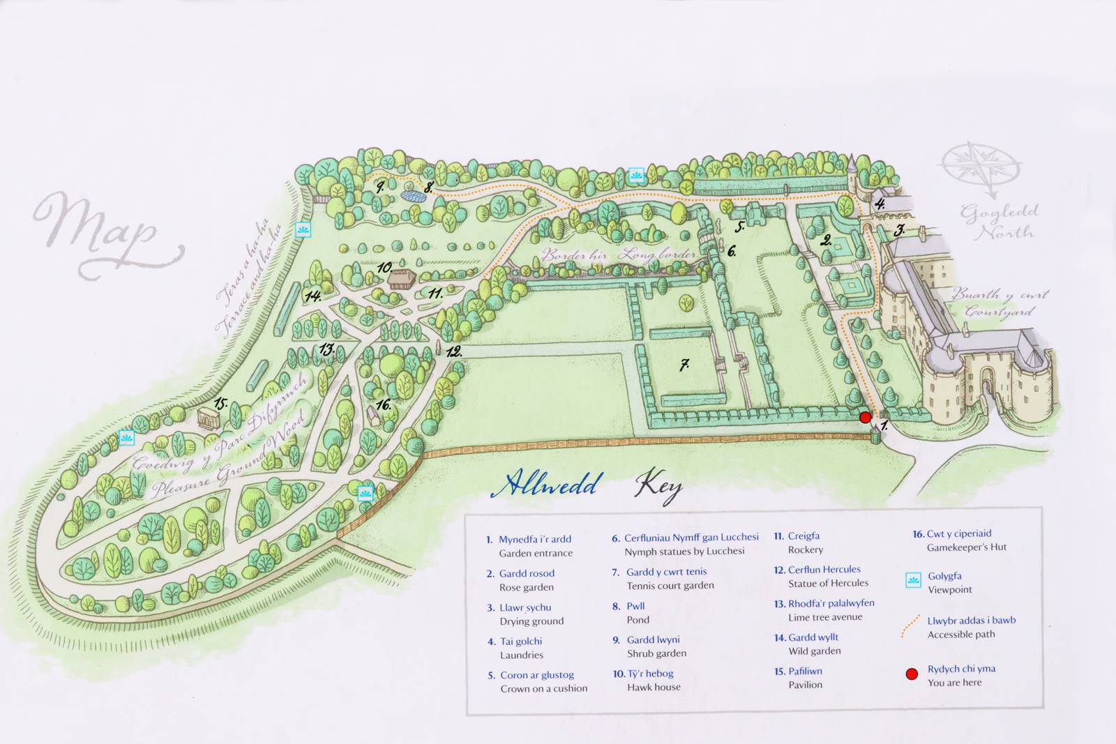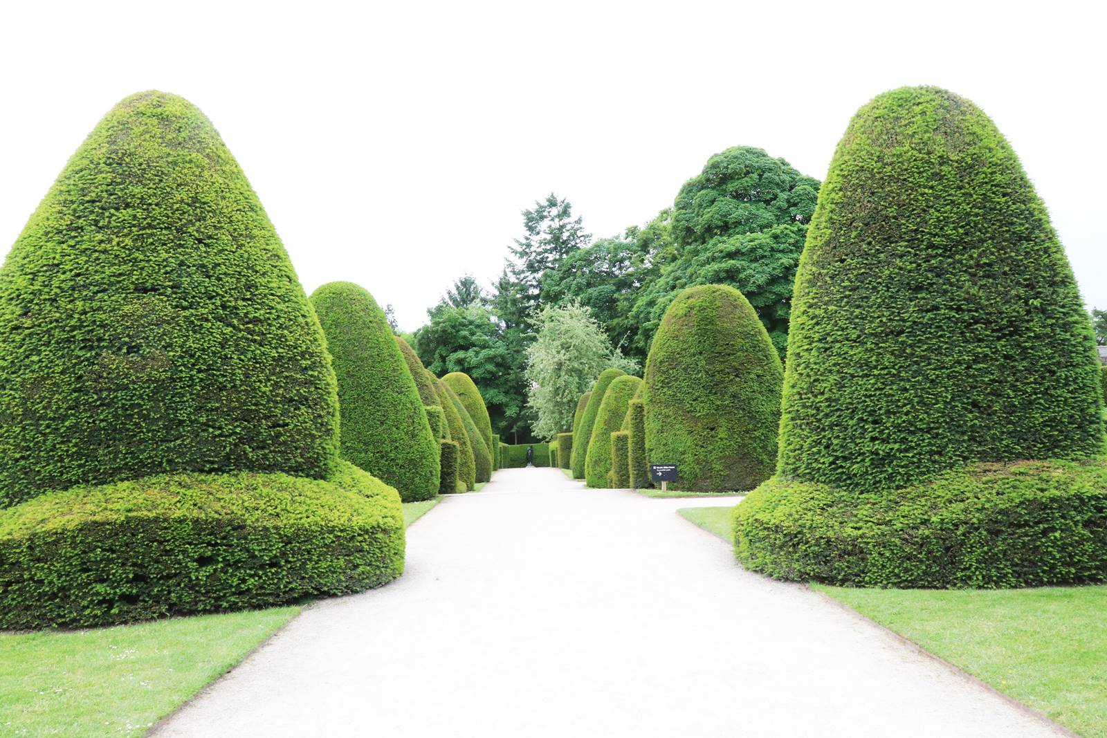 Au 19e siècle, des topiaires d’if et des haies ont été introduites par Richard Myddelton-Biddulph. Sur la terrasse supérieure, une allée de vingt ifs évoquant pour certains la silhouette d’un chapeau gallois ou d’un tambour allongé longe les remparts du château. Au début du 20e siècle, le millionnaire Lord Howard de Walden loue le château. Son épouse Margaretha de Walden demanda à la célèbre jardinière Norah Lindsay de créer sur la pelouse supérieure une longue bordure herbacée. Norah Lindsay participa aussi à l’aménagement des jardins de Hidcote Manor. (voir mon reportage sur Hidcote Manor)