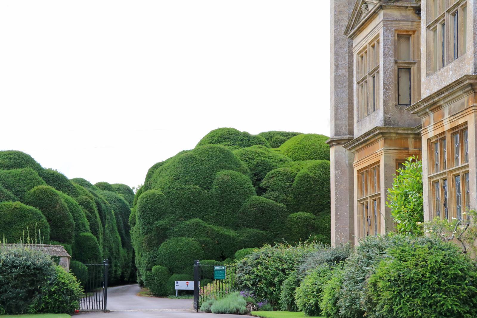 Un immense topiaire d’if, Taxus baccata, taillé en énormes vagues épaule le manoir côté ouest. Au nord, le parc assemble de nombreux arbres plus que centenaires dont un Cèdre du Liban, Cedrus libani et un vénérable platane d’Orient, Platanus orientalis planté par Capability Brown. On découvre d’autres spécimens remarquables, un Sequoia sempervirens, des hêtres pourpres, Fagus sylvatica purpurea, et de nombreux chênes, Quercus robus, Quercus cerris et Quercus palustris.