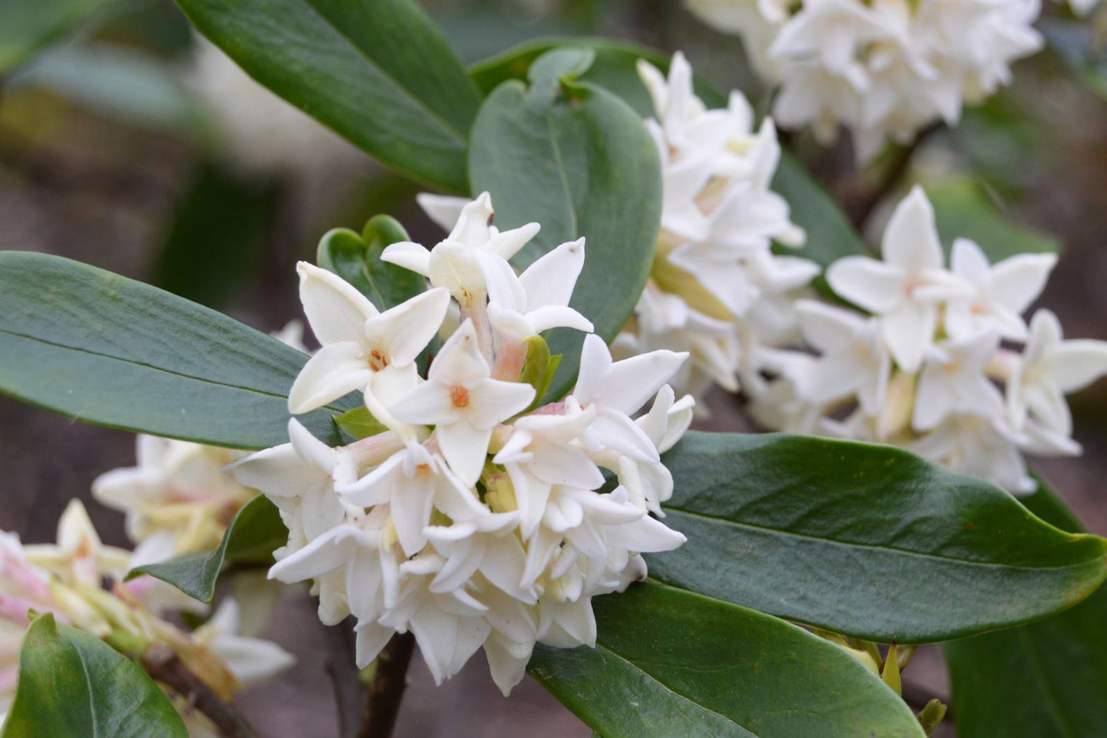 Originaire de l’Himalaya, le Daphne bholua est un arbuste vigoureux qui peut atteindre exceptionnellement 2 mètres de haut dans un climat océanique. L’arbuste est toutefois sensible au froid et résiste jusqu’à -10°C sur une courte période. C’est pourquoi on le rencontre plus souvent dans les jardins anglais ou breton. Sa floraison s’étale de janvier à avril sur un feuillage persistant, ce qui en fait une plante très décorative tout au long de l’année. Ses bouquets de grandes fleurs blanches teintées de rose lilas exhalent un parfum enchanteur, aux notes de girofle. L’arbuste exige une terre limoneuse au pH neutre riche en humus et bien drainée. On installe l’arbuste dans un endroit abrité et on protège les racines par un paillis organique.
