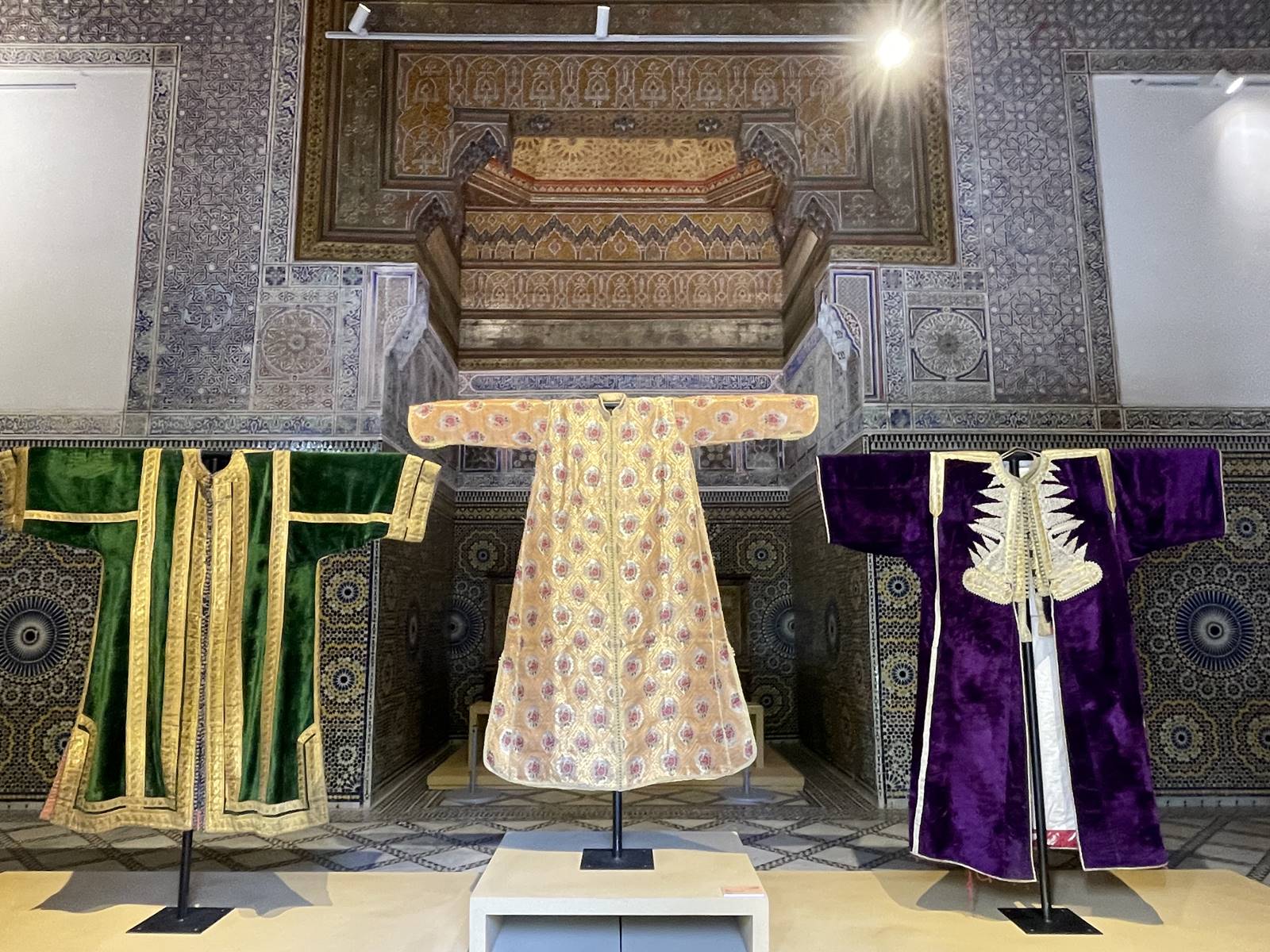 Le caftan est une tunique longue et amble, généralement confectionnée en velours, en soie ou en brocart. Il peut être ouvert sur le devant ou fermé par une une ceinture. Il est orné d’une ganse de soie tressée fermée par une rangée de boutons. A l’origine réservé à la cour royale, le caftan est devenu un symbole culturel du pays. Il est porté aussi bien par les hommes que par les femmes. La richesse de la décoration indique une appartenance sociale.