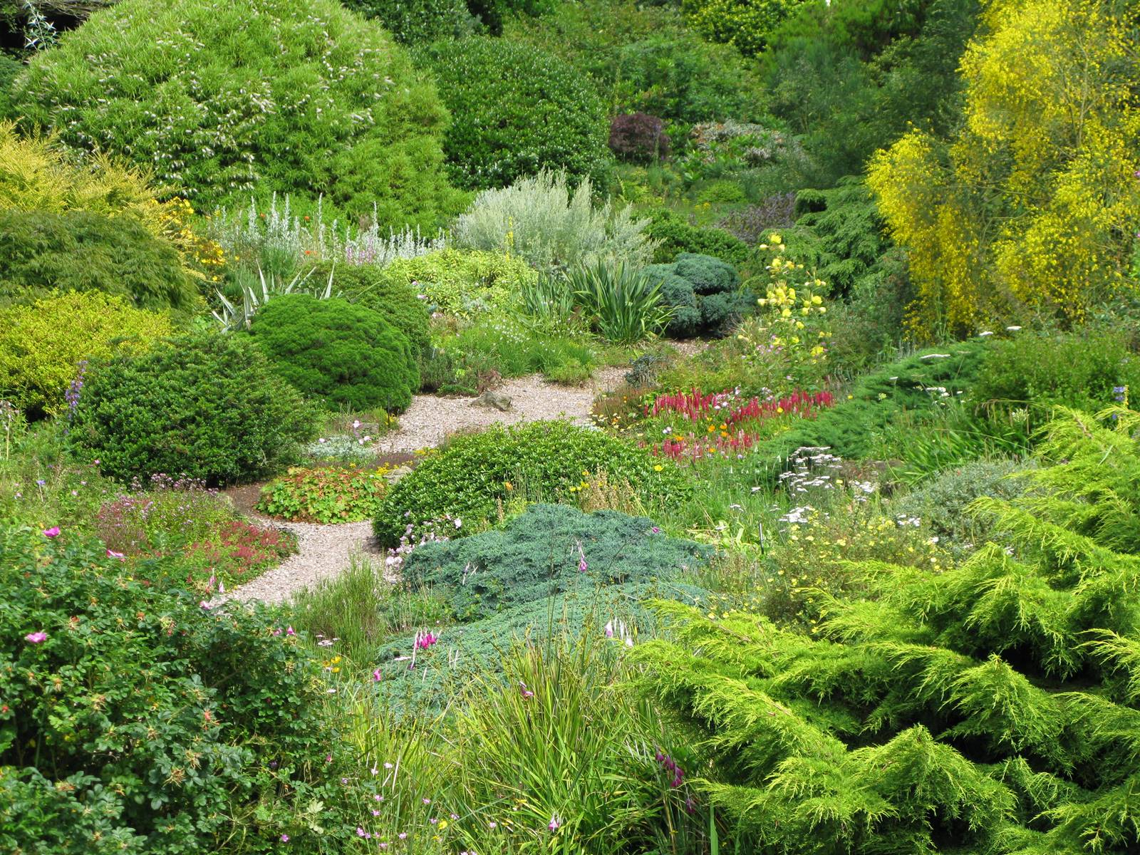 La pente exposée au sud abrite une immense rocaille où prospèrent des plantes alpines, des conifères en coussins et des arbustes au feuillage persistant.