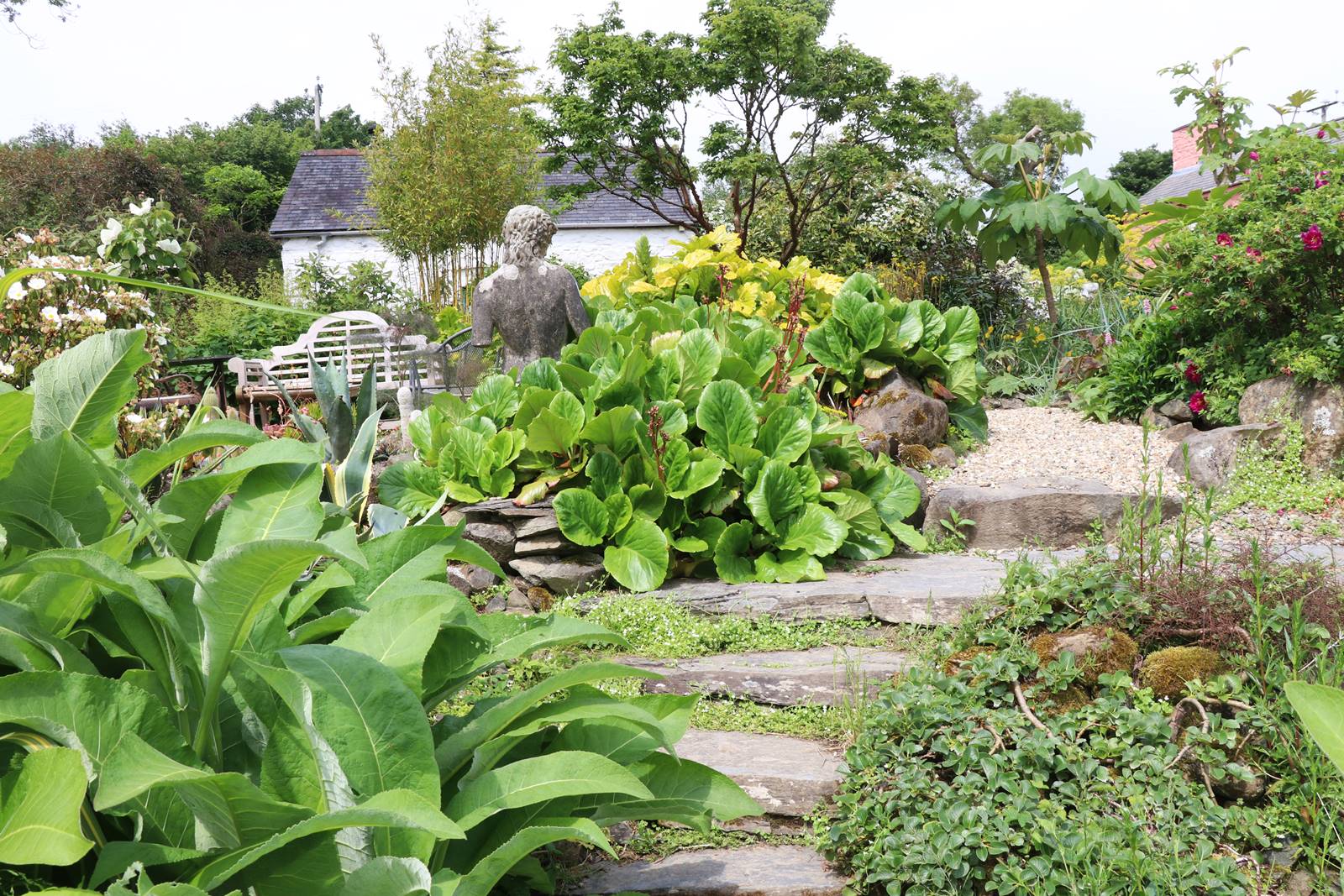 Le jardin ensoleillé est foisonnant, envahi de dahlias, de salvias, de Persicaria amplexicaulis, d’agapanthes, d’Aeonium ‘Zwartkop’ et d’autres plantes succulentes cultivées en pot. Une sculpture de l’artiste John Cleal est encadrée par une vigne pourpre, Vitis coignetiae, qui couvre le petit cottage.