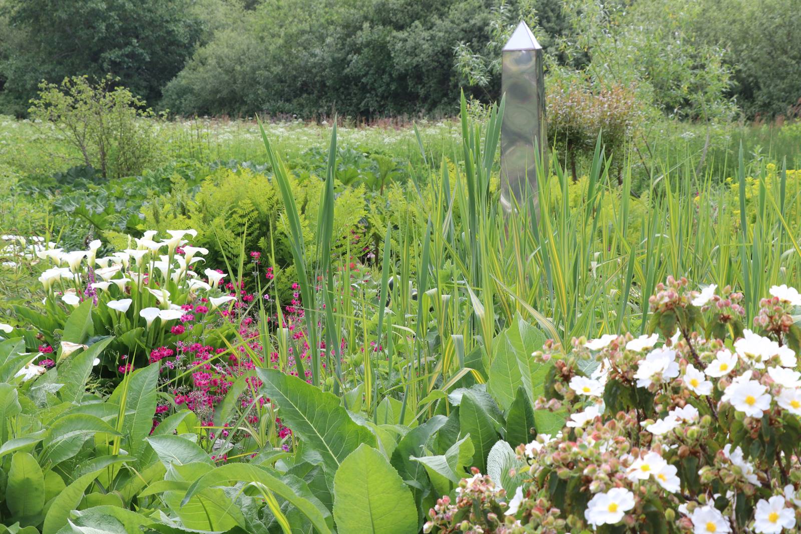Le jardin de tourbière est ancré par un sentier en forme de croix. Au centre se dresse un puissant obélisque qui brille de mille feux. Les plantations denses alternent des feuillages décoratifs des Gunnera, les épis des graminées et les floraisons des plantes vivaces. Le jardin cède subtilement la place à une prairie humide qui s’étend vers une pièce d’eau .