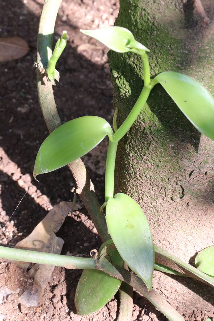Originaire d’Amérique centrale, le vanillier, Vanilla planifolia est une liane herbacée de la famille des Orchidacées qui peut atteindre dix mètres de long. A l’opposée des feuilles naissent des racines adventives capables de se fixer fortement à des supports et d’absorber l’eau. Les fleurs odorantes blanches ou jaune clair donnent naissance à des fruits verts regroupés en longues grappes pendantes. Arrivée à maturité, la gousse de vanille prend une couleur brun chocolat. Après de nombreuses transformations, les gousses de vanille noires, souples et brillantes sont commercialisées en gousse, en poudre ou liquide, libèrant leur parfum inimitable. (voir mon reportage sur la Vanille)
