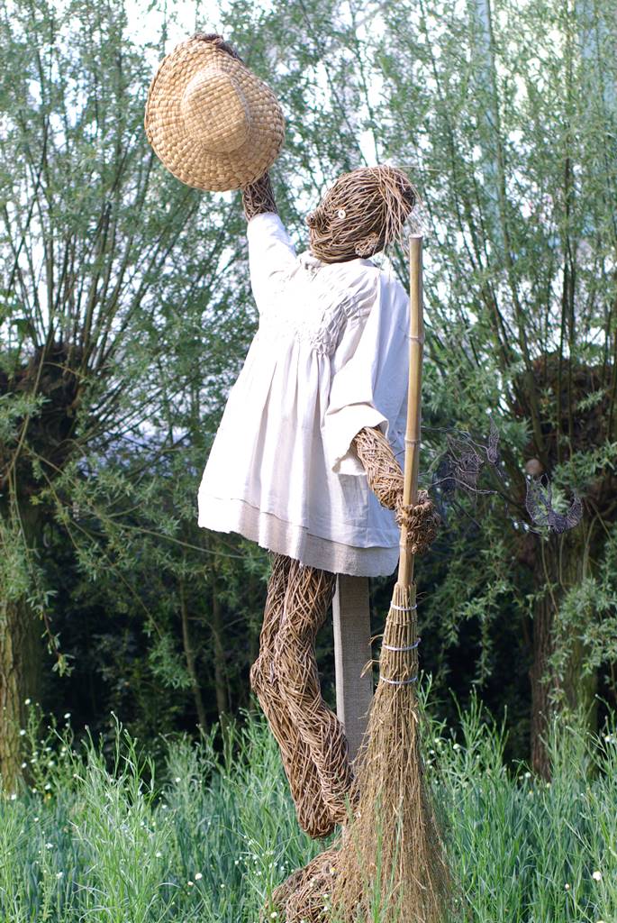 Une vieille casquette, une chemise en guenilles, un gilet, tout lui va à ce gardien candide. Le pantalon solidement accroché par des bretelles, il donne une nouvelle vie à la jaquette du grand-père grignotée par les mites. Donnez-lui un bâton, il va se prendre pour un bonhomme de neige. Portant un balai, il ressemble à une sorcière. Armé d’un râteau, il devient votre complice jardinier. Entouré d’une bassine en zinc ou d’un évier en pierre recyclé en jardinière ou en bassin pour oiseaux, on l’installe au fond du potager, près d’un massif de groseilliers ou dissimulé dans une chambre de verdure.