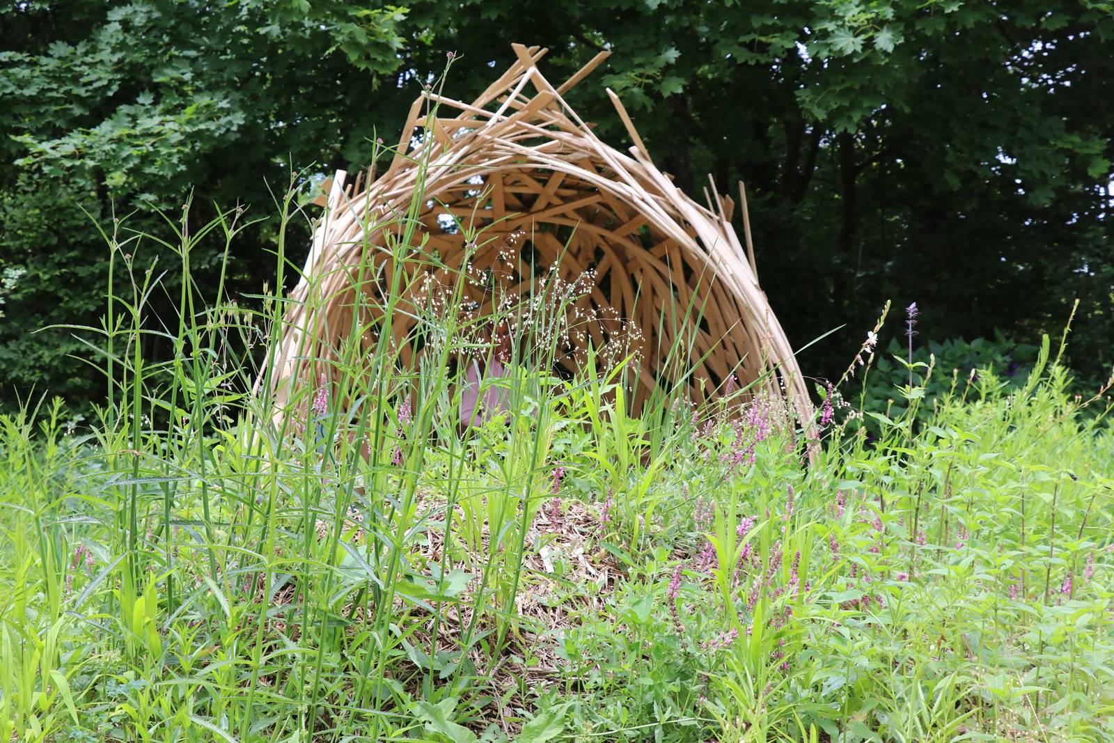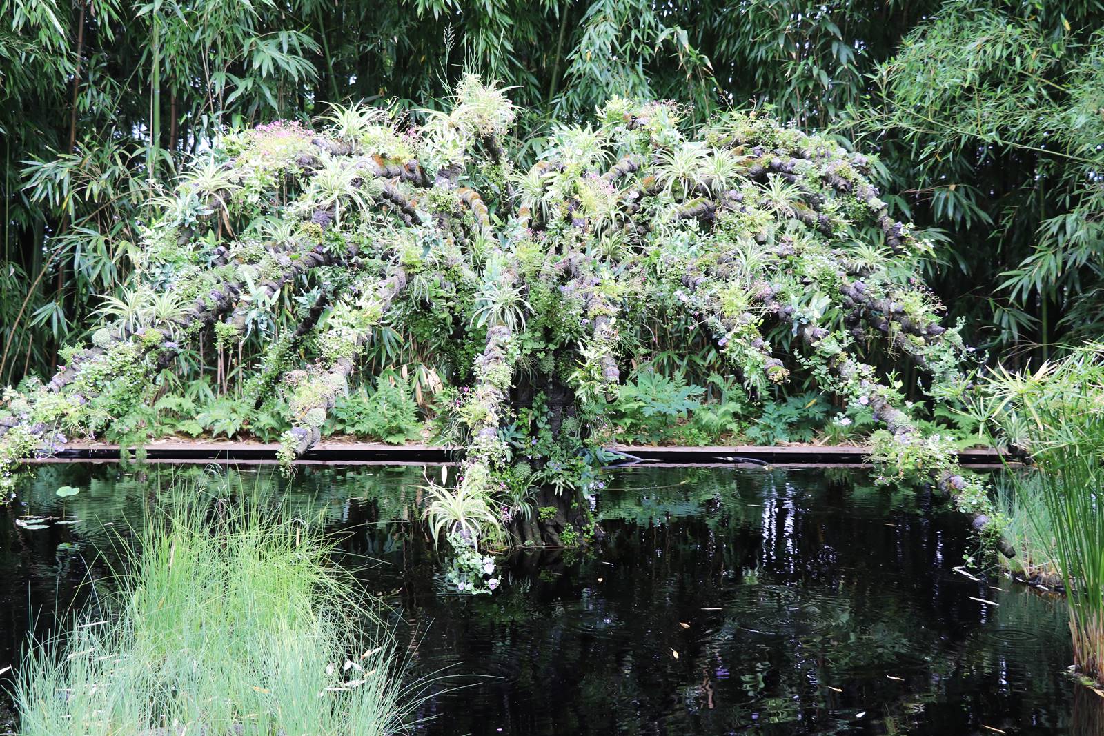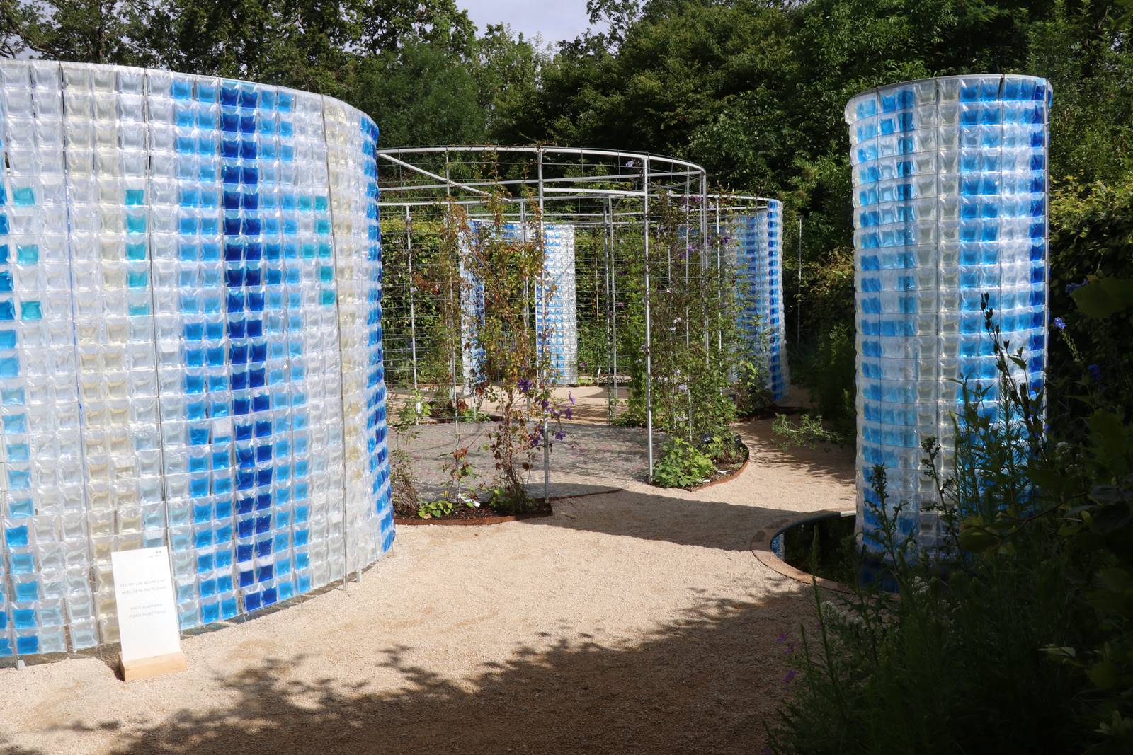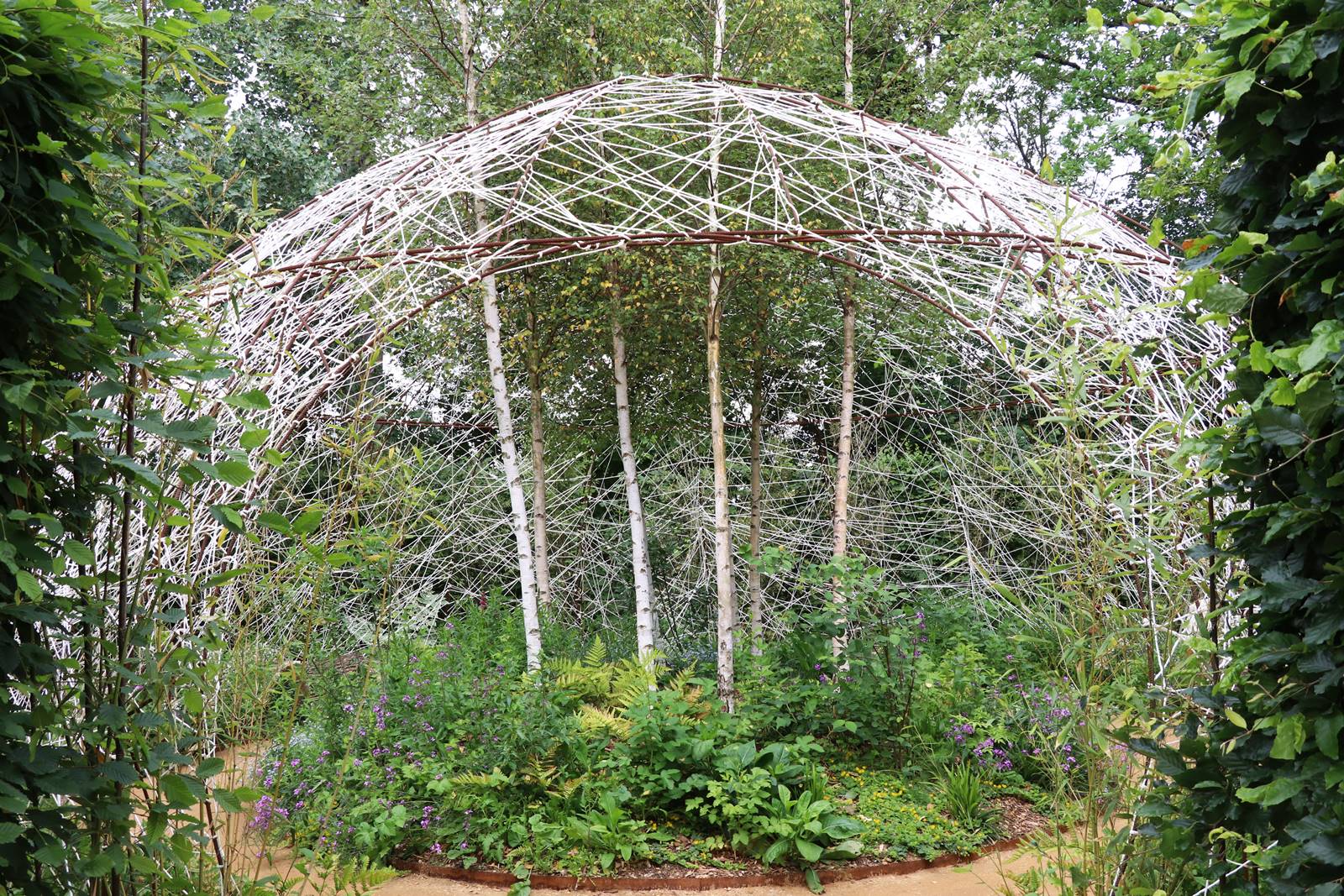 ‘Le Cocon végétal’, Belgique. Epargné par l’intervention de l’homme, le jardin est un espace de nature préservée, comme la chrysalide du papillon. Ce cocon, tendu de fils blancs sur une structure en forme de dôme donne naissance à une forêt vierge qui symbolise la résilience de la nature face à l’activité humaine.