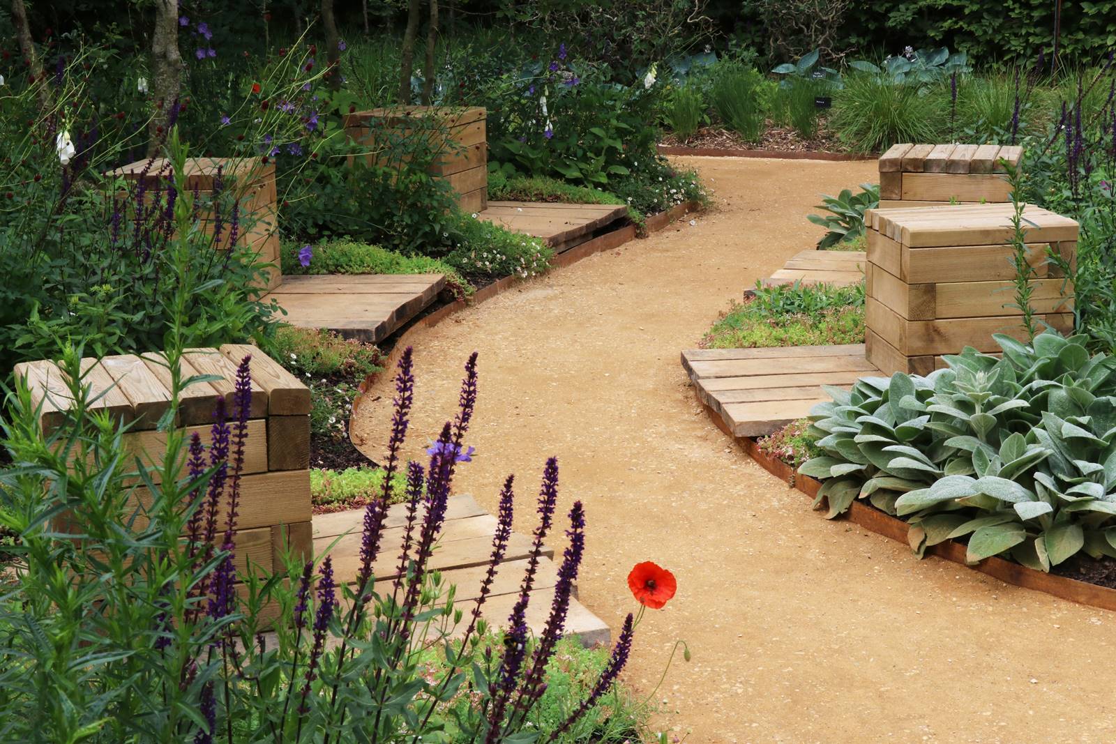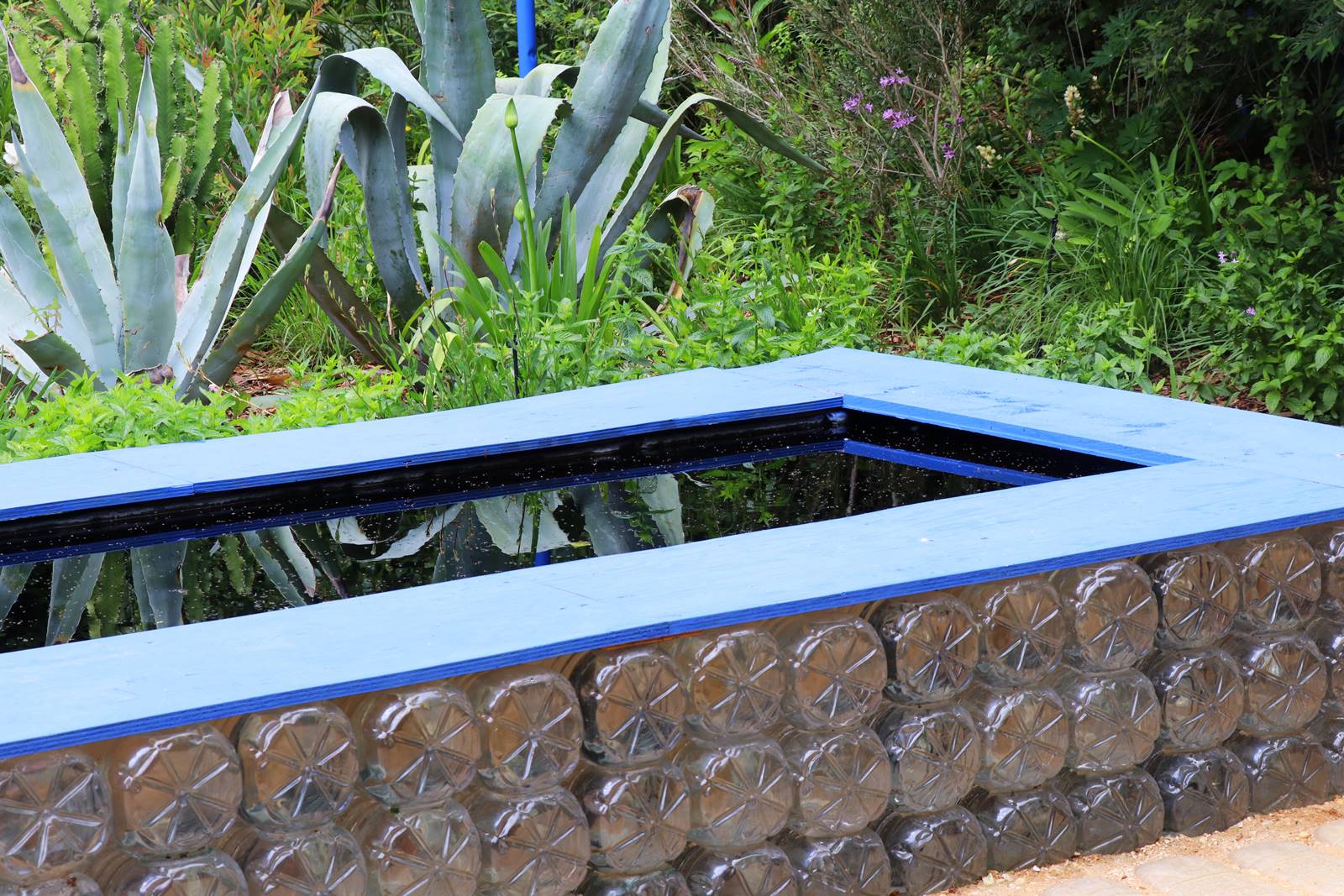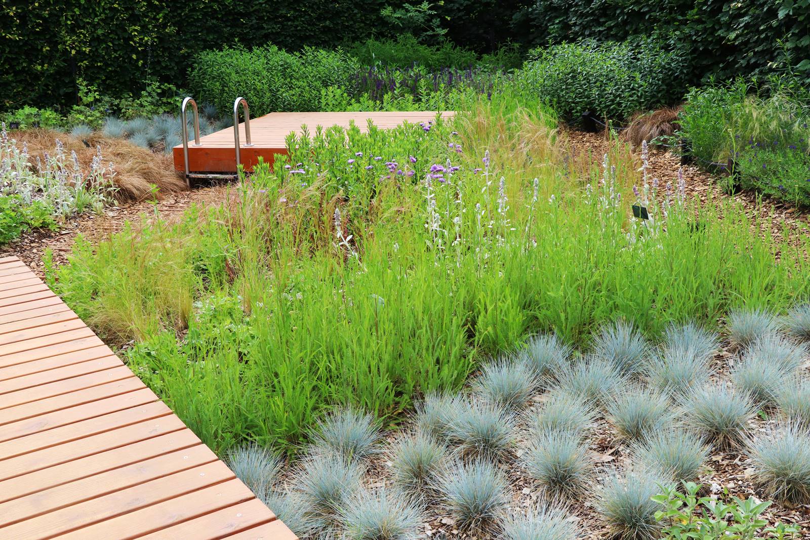 ‘Bleu songe’, France. Malgré l’absence d’eau, ce jardin évoque avec force les grands paysages de lacs. Des plantes aux couleurs des flots baignent un ponton de bois et invitent à une promenade méditative. Une échelle de baignade métallique propose de s’embarquer dans ce radeau imaginaire. Il marque l’entrée dans un univers qui contraste avec le tumulte et l’agitation de notre monde.