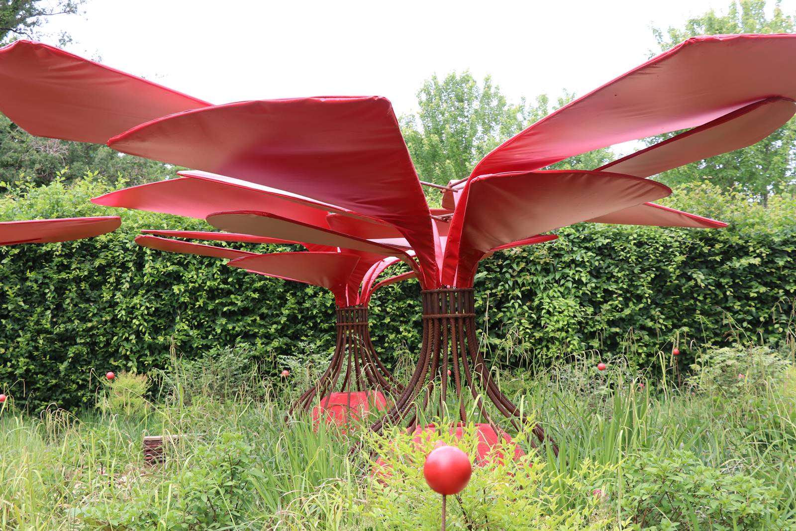 ‘Grenade’, France. Inspiré de l’oya, un système d’irrigation naturelle sous forme de jarre en terre cuite, ce jardin dresse de grandes oyas qui s’épanouissent telles des fleurs géantes ou des grenades, fruit rouge du grenadier. Elles déploient de larges pétales afin de recueillir les eaux de pluie. Ces objets participent au cercle écologique vertueux auquel l’homme prend part.