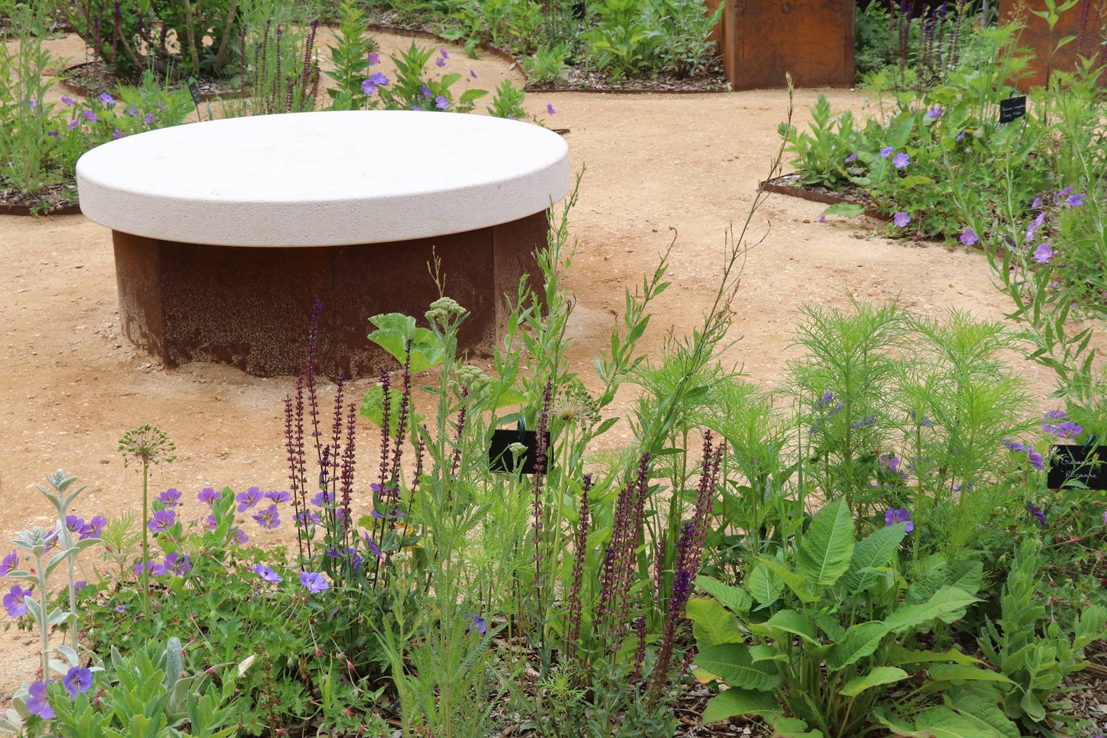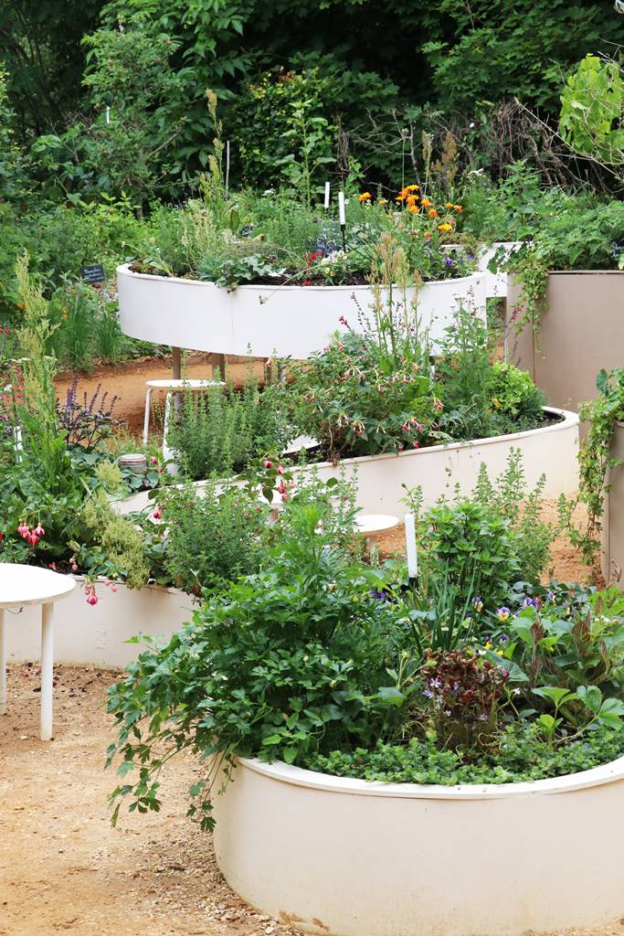 ‘Le Banquet’, France et Grande Bretagne. Ce jardin s’articule autour de tables de verdure entière plantées de fleurs, légumes et plantes aromatiques cultivés en permaculture. La table apparaît comme le lieu privilégié de la convivialité, du partage, de la joie, de la rencontre et de l’amour sous toutes ses formes.