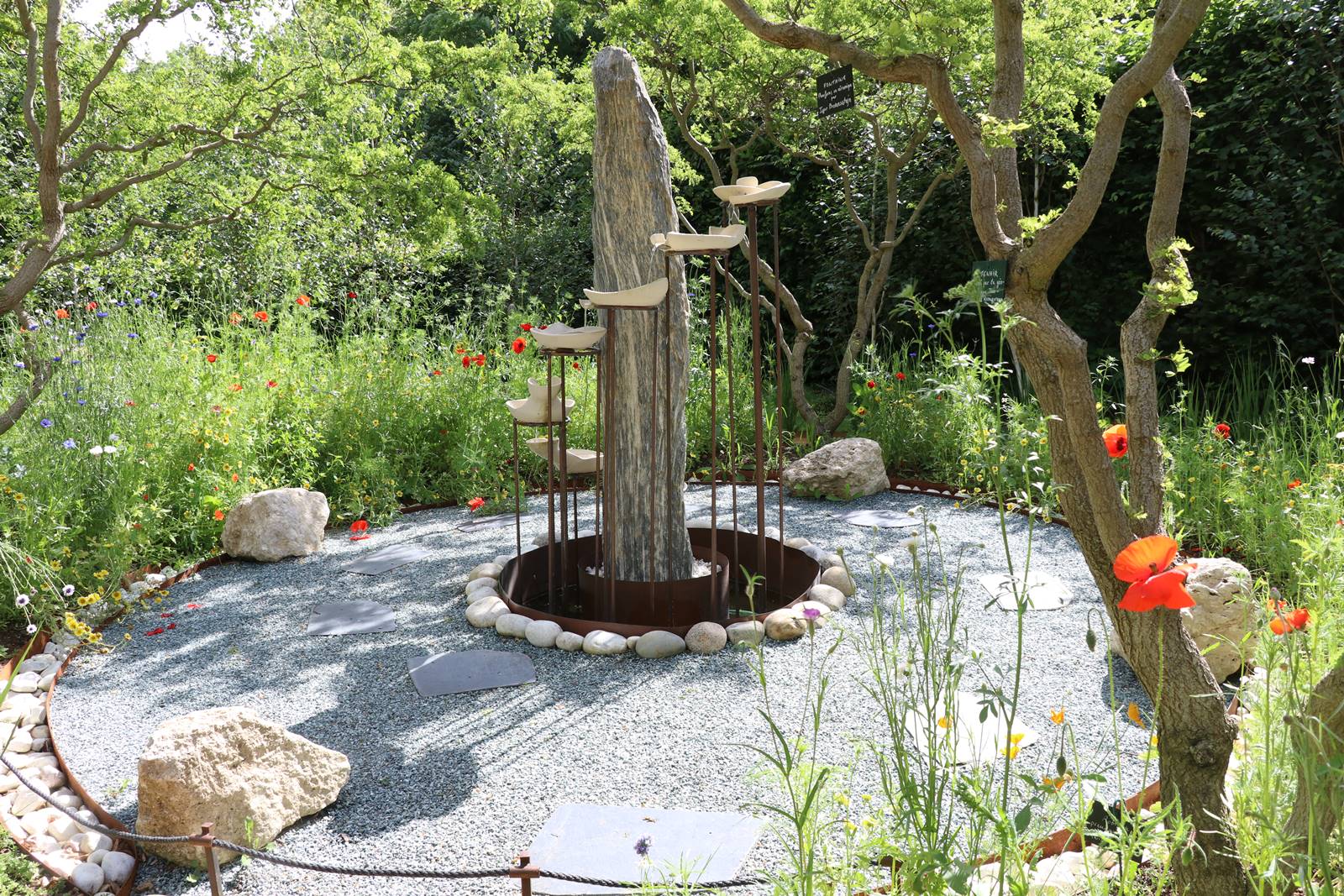‘Dans un jardin d’illusions’, France et Chine. Ce jardin s’organise autour de la forme idéale du cercle. Le parcours circulaire est bordé par une allée extérieure fleurie qui s’enroule autour d’une structure ajourée. Celle-ci porte la silhouette d’une montagne chinoise et conduit dans le coeur zen du jardin. Le jardin fusionne les illusions occidentales et orientales et ouvre le champ de l’imagination.