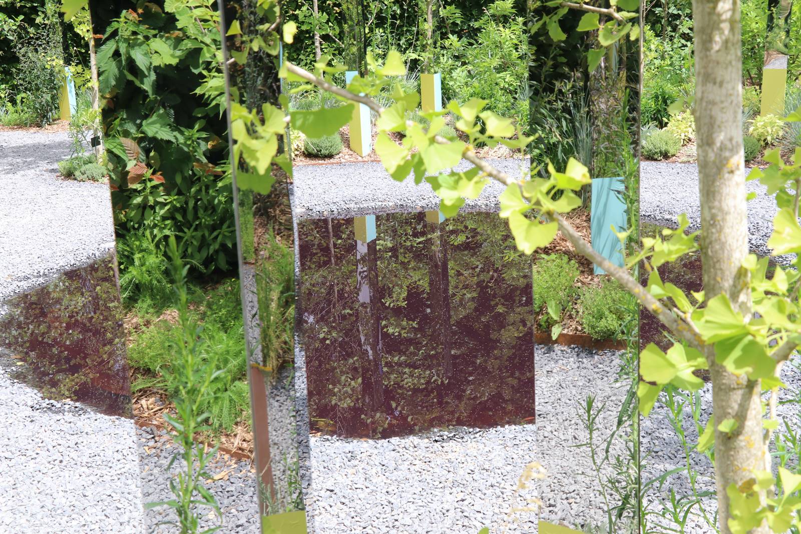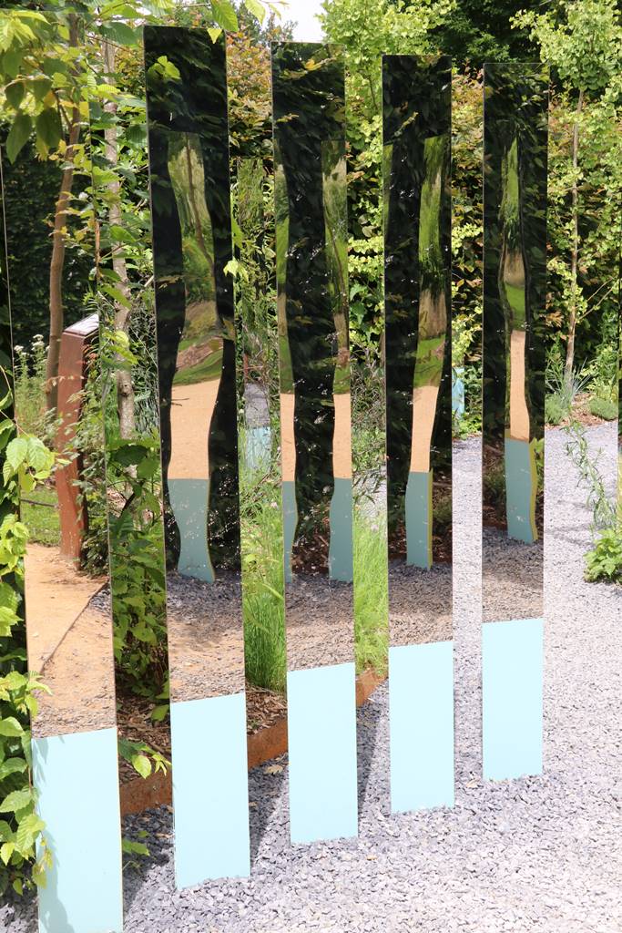 ‘Jardin de la Réciprocité’, Etats-Unis. A travers des totems et quelques points d’eau, des jeux de miroirs absorbent les images du promeneur et du paysage dans une interconnexion idéale. Le jardin se compose de plantes médicinales et sacrées. Il célèbre l’interdépendance de l’homme et de la nature. Où finit l’être humain? Où commence la nature? Dans le même paysage…