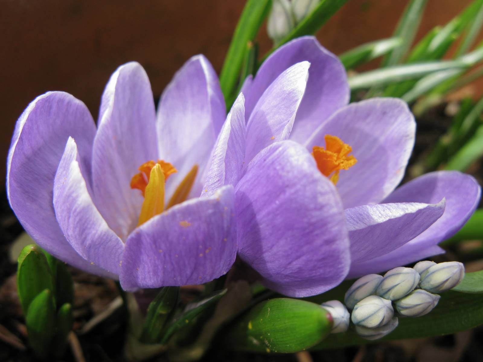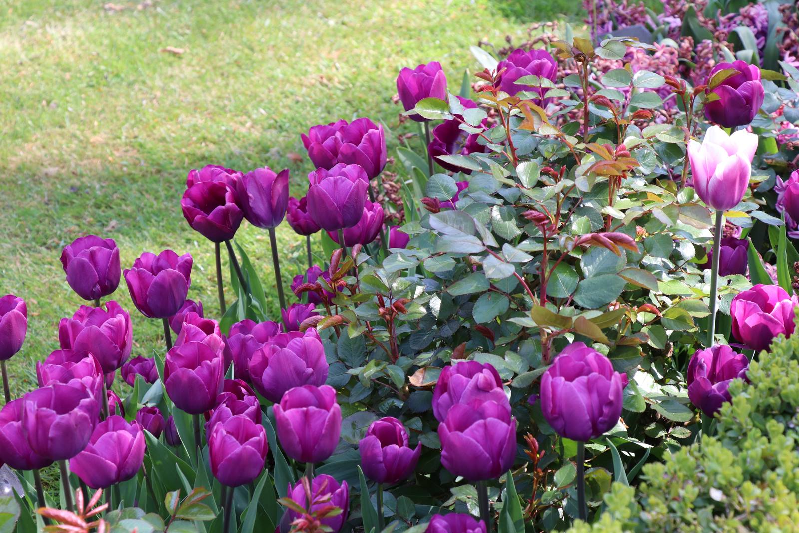 Parmi les bulbes à floraison printanière on retrouve de nombreuses fleurs mauves. Les premières à s’ouvrir sont les Crocus vernus, les jacinthes et les tulipes suivies de la fritillaire pintade Fritillaria meleagris aux fleurs en damier pourpre à petites taches blanches et la fritillaire de Perse Fritillaria persica aux longues grappes de fleurs en clochettes pourpre sombre ou violet presque noir.