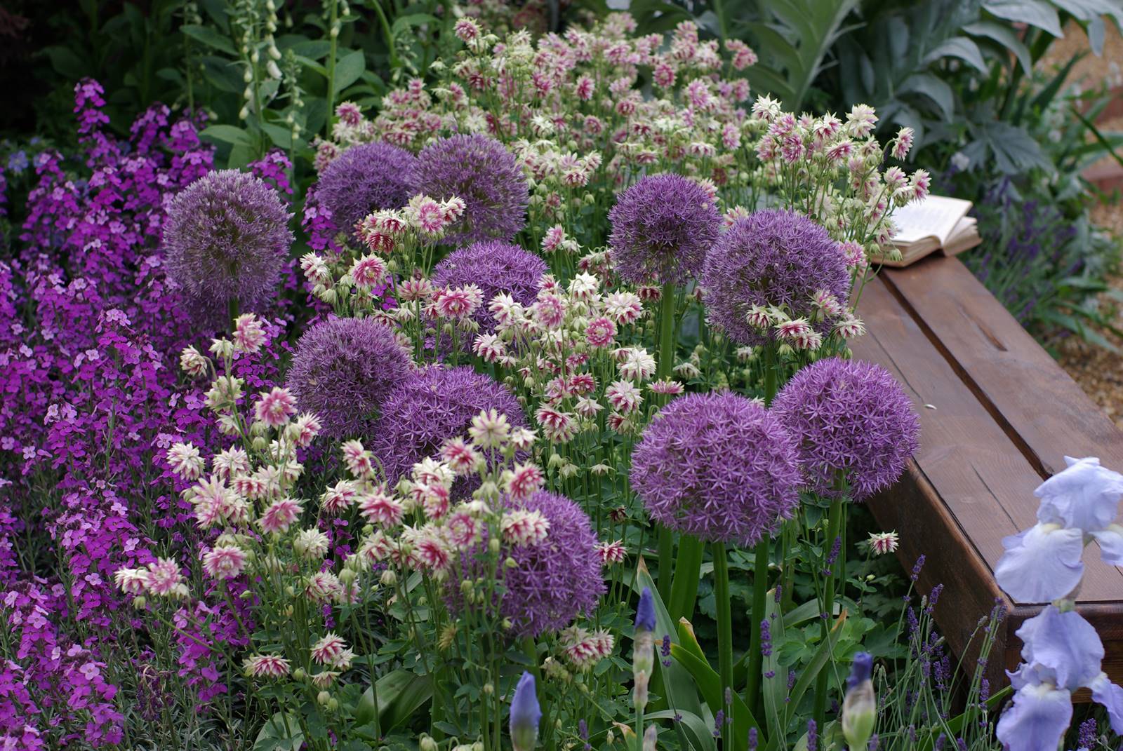 Mais en été, les parterres sont constitués principalement par des plantes herbacées vivaces. On retrouve le Géranium vivace qui se décline en de multiples teintes mauves, les fleurs minuscules de l’Epimedium, les épis dressés des lupins Lupinus et des Delphinium souvent teintés de bleu ou de rose, l’Agastache ‘Blue Boa’ aux fleurs pourpres en bouton et lilas à maturité. Il y a aussi les grandes panicules de fleurs en clochettes de la campanules Campanula lactiflora et la Campanula poscharskyana, une petite campanule qui tapisse les murs.