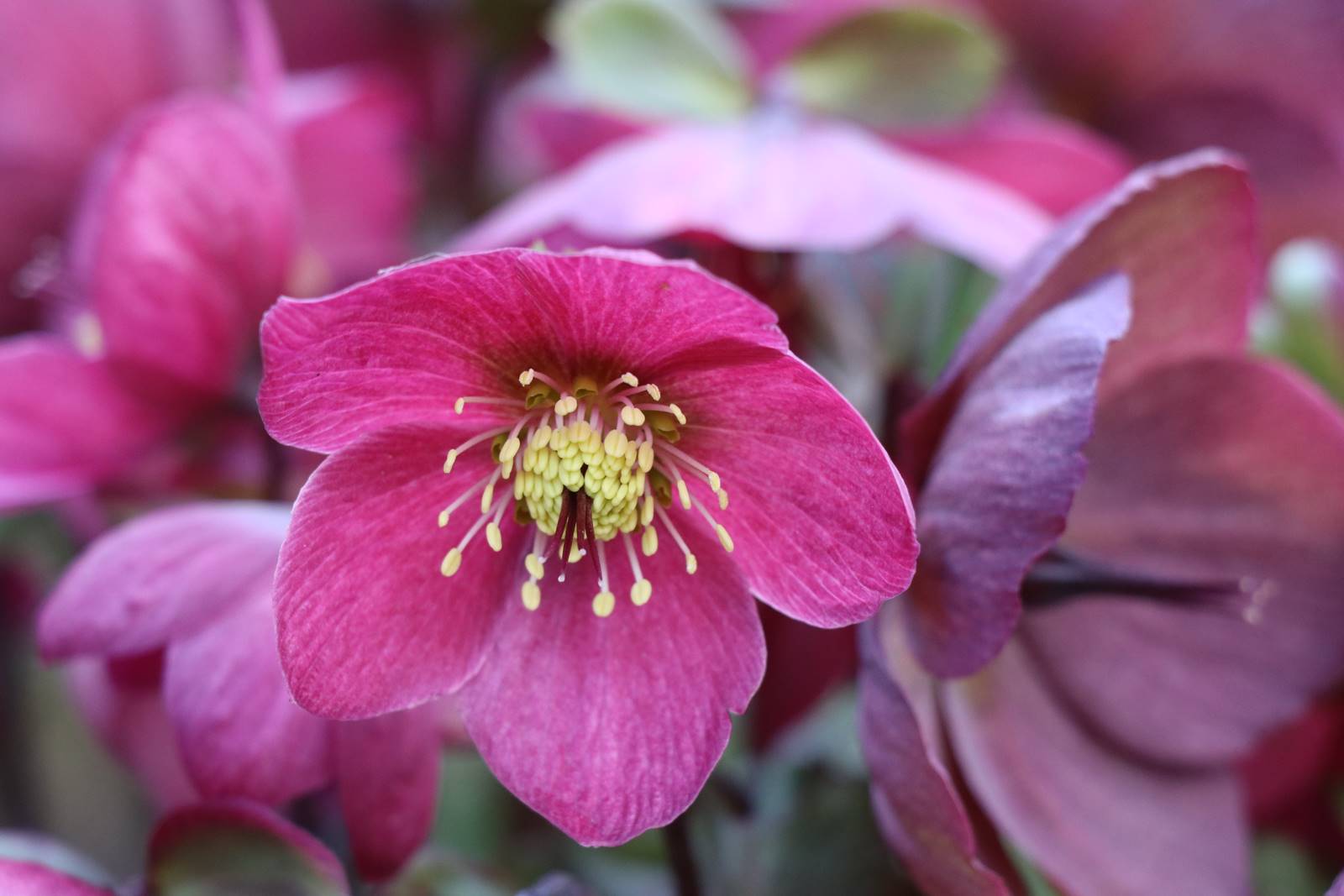 C’est à la lumière de la fin de l’hiver que se révèlent le mauve presque noir nimbé de brumes et de mystère de l’hellébore orientale Helleborus orientalis. Dans les pots et jardinières les pensées et violettes Viola cornuta sont en fleurs tout l’hiver jusqu’au début de l’été.