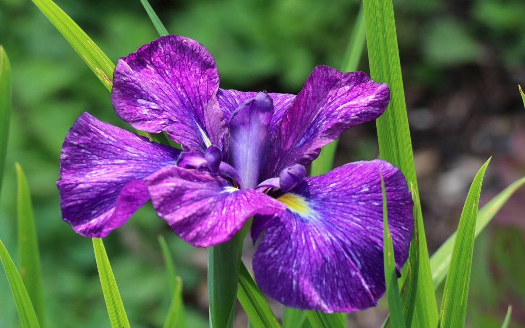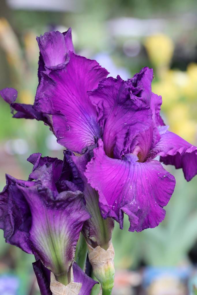 La famille des iris rassemble de nombreuses espèces et variétés à fleurs pourpre, l’iris des jardins Iris germanica, l’iris de Sibérie Iris sibirica et l’iris du Japon Iris ensata.