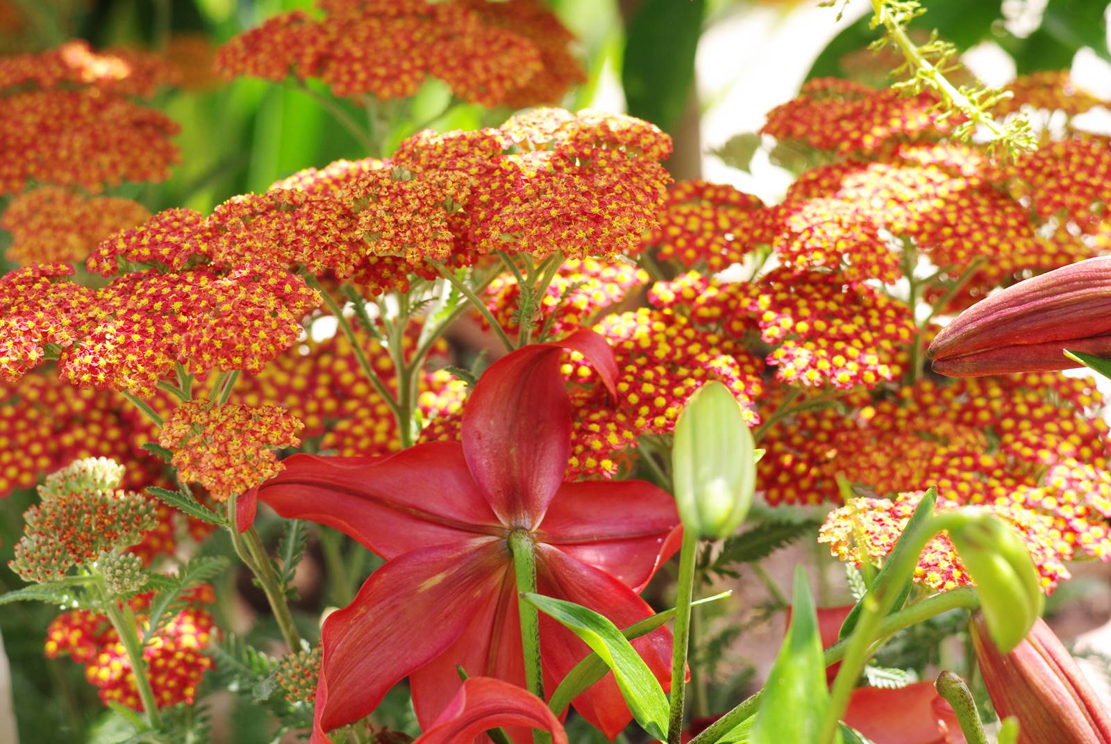 Les pavots de Californie Eschscholzia californica, le pavot d’Islande Papaver nudicaule et les hémérocalles Hemerocallis lancent la saison estivale. Au coeur de l’été fleurissent les achillées Achillea, Crocosmia, et le tritome Kniphofia couleur feu qui forment de grands groupes. On y intègre le lis tigré Lilium tigrinum au parfum très agréable.