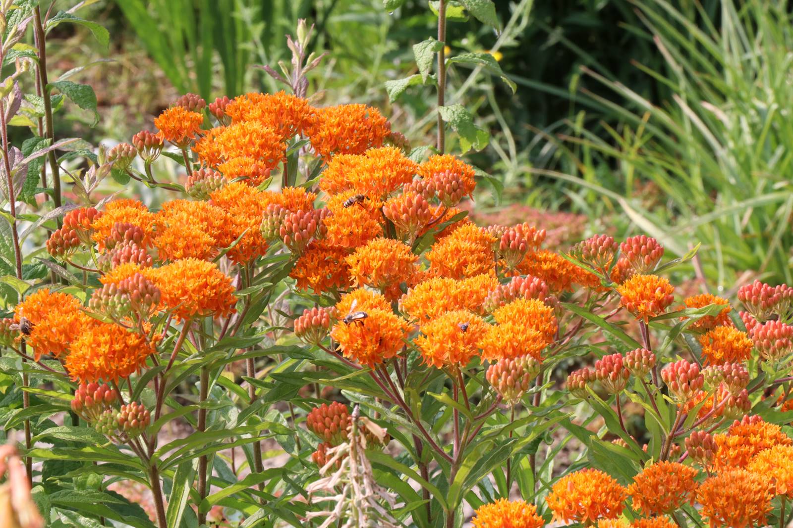 Les bordures fleuries sont ensoleillées par l’asclepiade tubéreuse Asclepias tuberosa, le muflier gueule de loup Antirrhinum majus, le souci Calendula, la gaillarde Gaillardia, et le Coreopsis à l’orange fardé de rouge.
