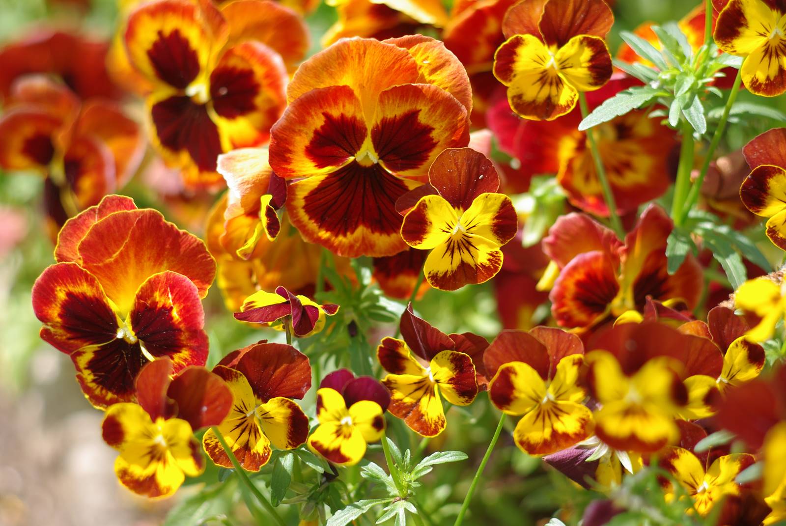 Au printemps, l’orange est utilisé avec parcimonie. Les fleurs orange doivent être choisies avec soin et non apparaître écrasantes par leur volume. Quelques tulipes orange abricot ou des giroflées des murailles Erysimum cheiri dans les tons bronze doré réchauffent les bordures et les jardinières en compagnie des petites pensées Viola. Dans les massifs, l’orange claquant des fritillaires Fritilaria est tempéré par le feuillage bronze de l‘euphorbe à bractée orange Euphorbia griffithii ‘Fireglow’.