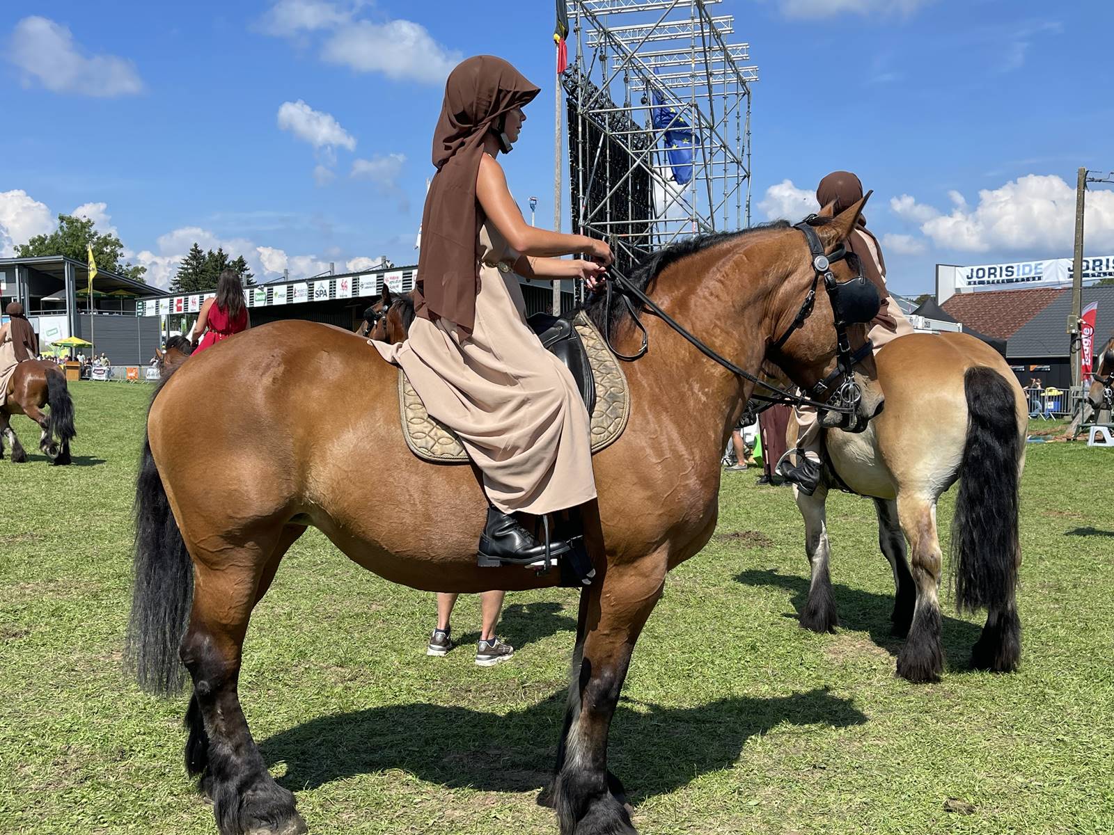 A l’entrée du grand hall de Libramont, quatre stalles sont occupées par de superbes chevaux de trait ardennais qui sont mis en beauté par leur propriétaire en bichonnant leur queue et leur crinière. Considéré comme le plus ancien cheval de trait d’Europe, la race est historiquement élevée dans la région des Ardennes. Très puissant et résistant, ce cheval est reconnu pour son tempérament doux. Il est utilisé principalement pour le débardage en forêts et les loisirs équestres.