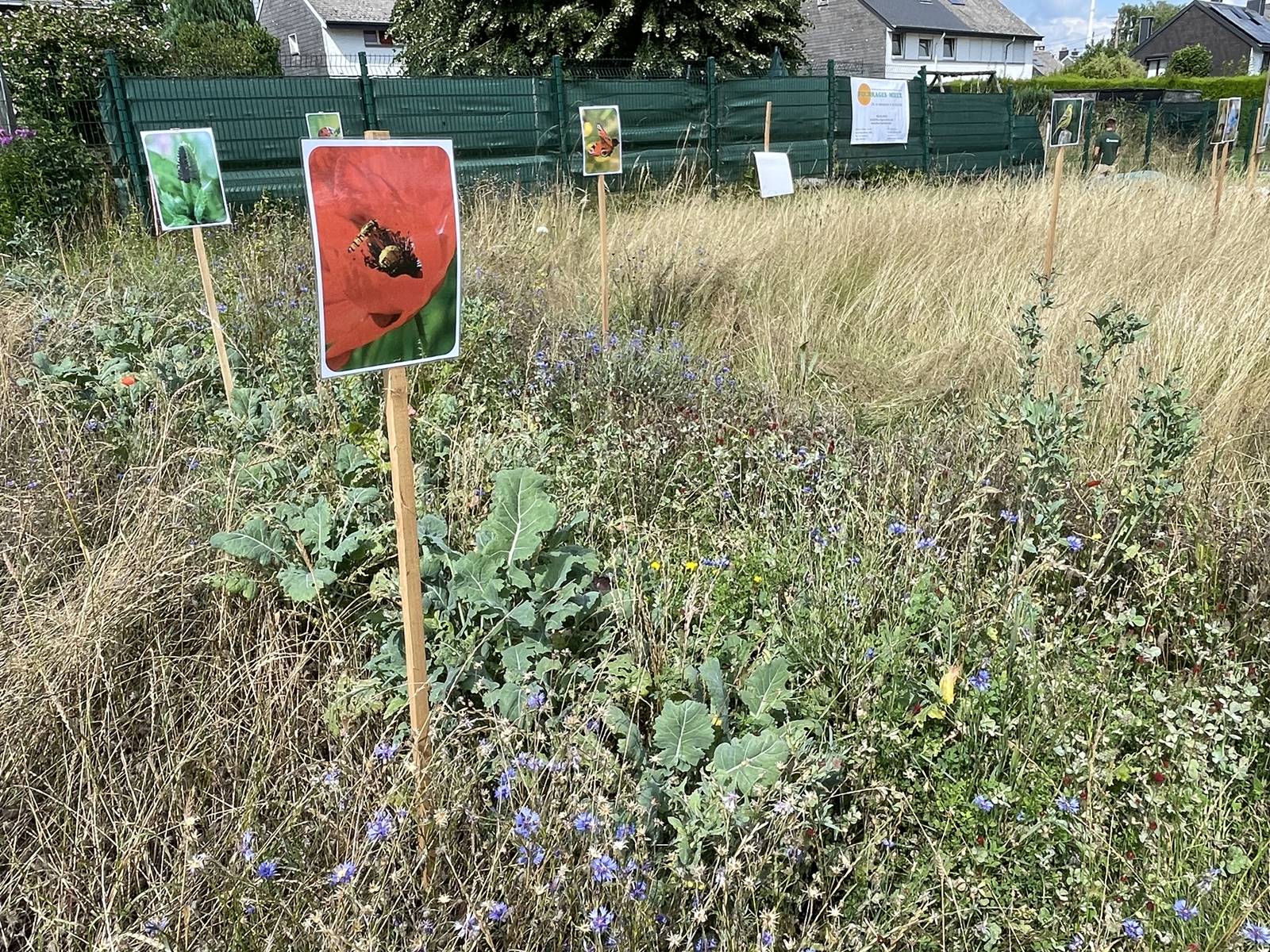 A la fin de l’été, des fleurs de prés ou de champs sont semées tels que les bleuet, coquelicot, achillées millefeuille, centaurée, grande marguerite, mauve musquée, chrysanthème des moissons, lotier, luzerne, trèfle des prés. La parcelle est à faucher une à deux fois par an afin d’offrir du nectar et du pollen aux insectes pollinisateurs comme les abeilles et les bourdons.
