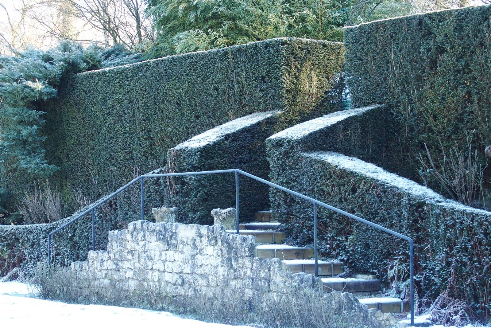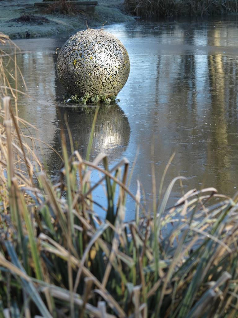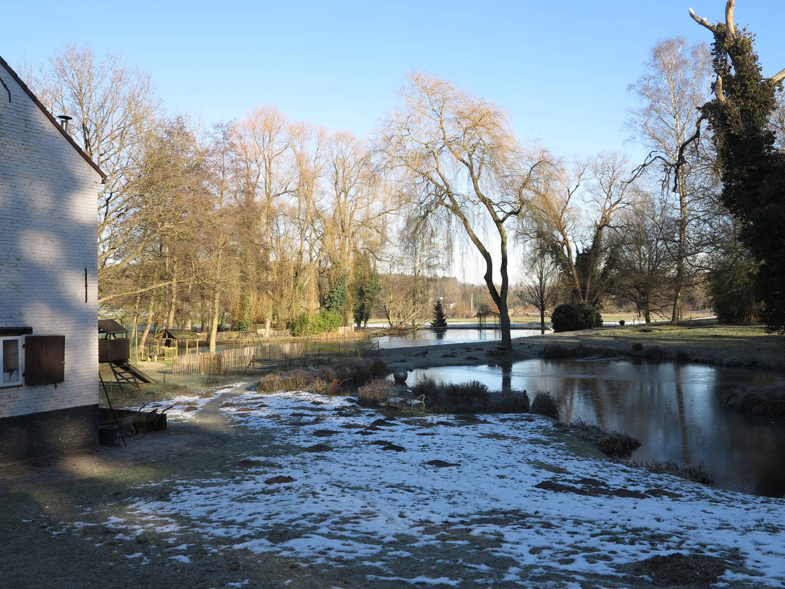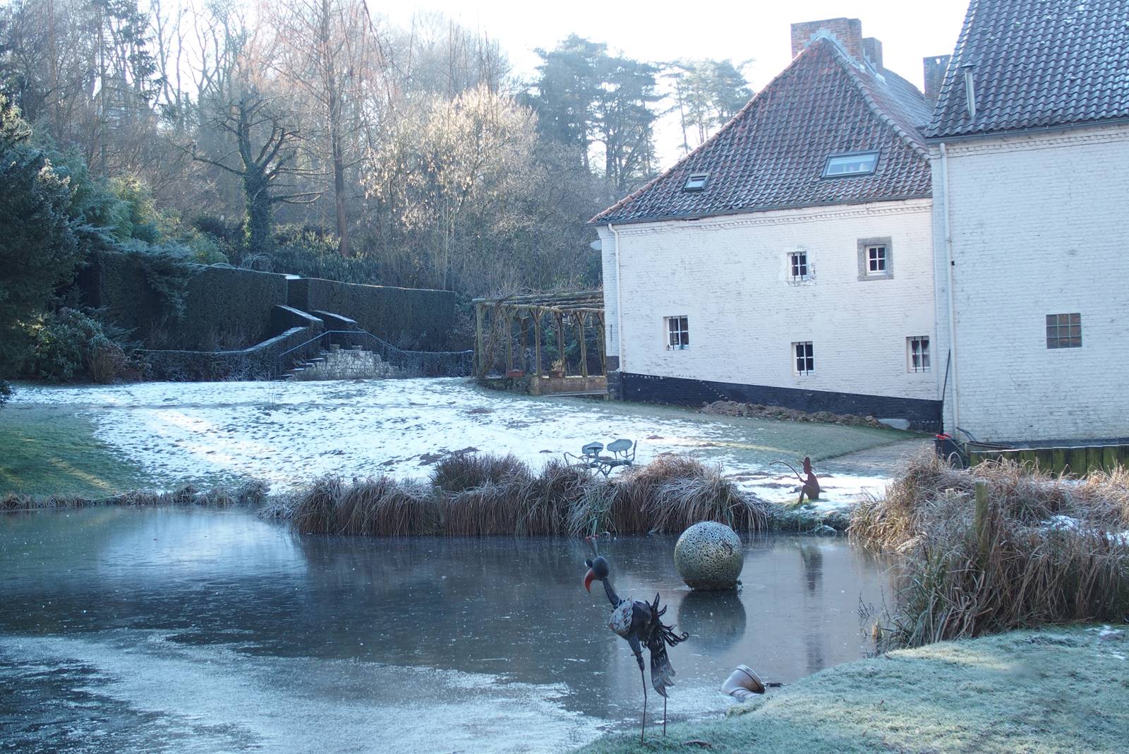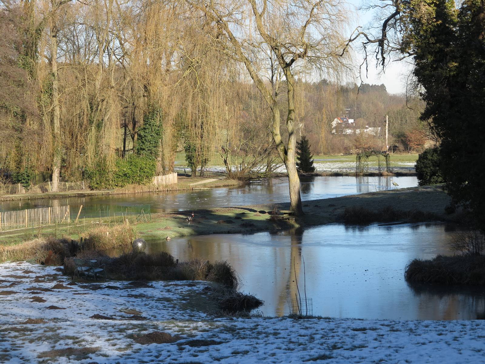 La partie basse du jardin est plus naturelle. Bordant la rivière, elle se fond dans le paysage. Partout, des bancs invitent à faire une pause et à s’imprégner de ce petit bout de nature enveloppé dans sa pellicule de glace. Au delà de la gloriette qui borde le grand étang, le jardin se prolonge dans la vallée de la Lasne où des colonies d’oies bernaches du Canada ont élu domicile.