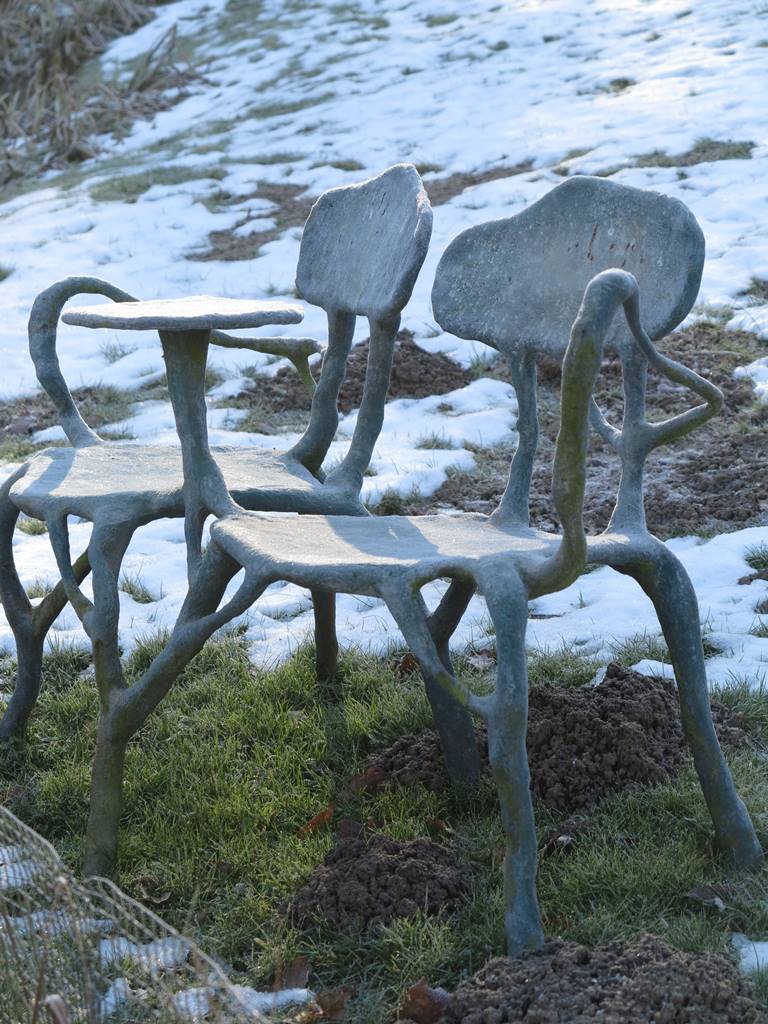 C’est à la fête des plantes d’Aywiers qu’elle a découvert ces deux belles chaises en fonte très poétiques inspirées du monde végétal sculptées par Xavier Dumont, de Folie de Jardin Quelques sculptures d’oiseaux animent le bord des étangs, tenant compagnie aux grenouilles et aux libellules. (voir mon reportage sur le mobilier organique de Xavier Dumont)
