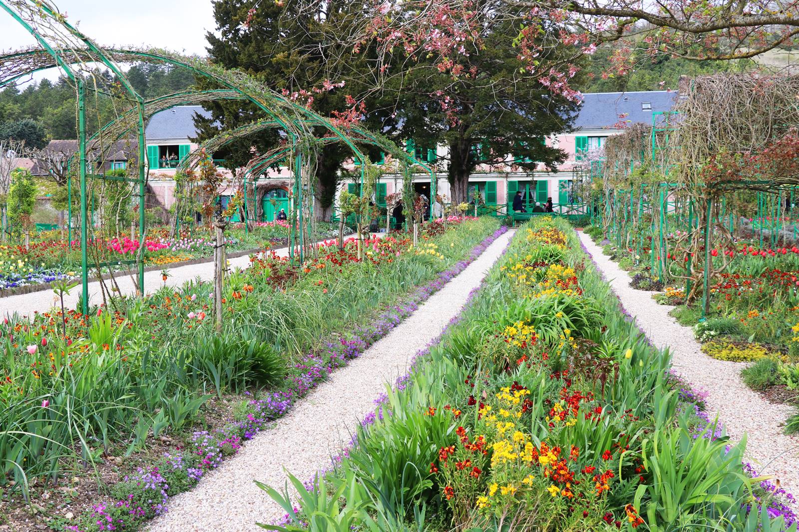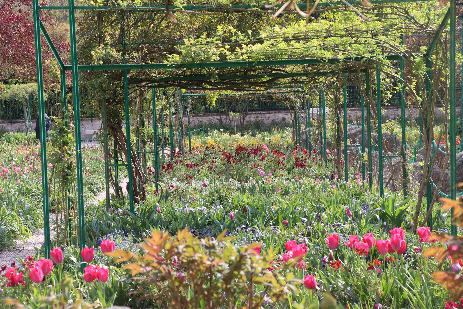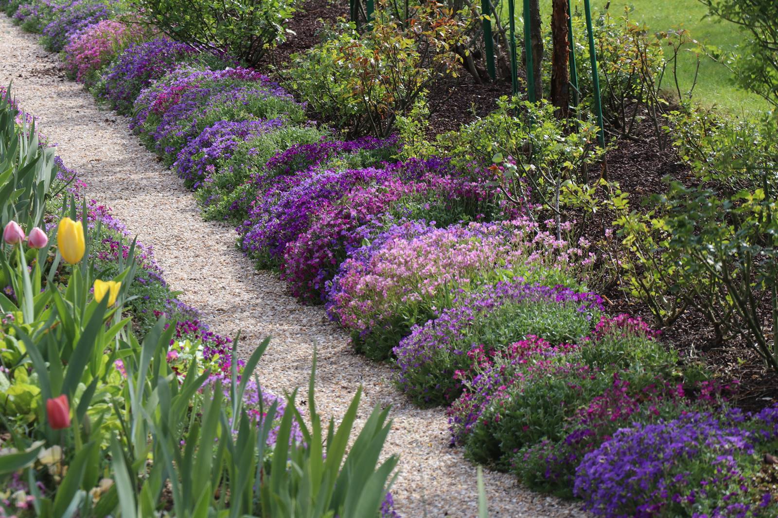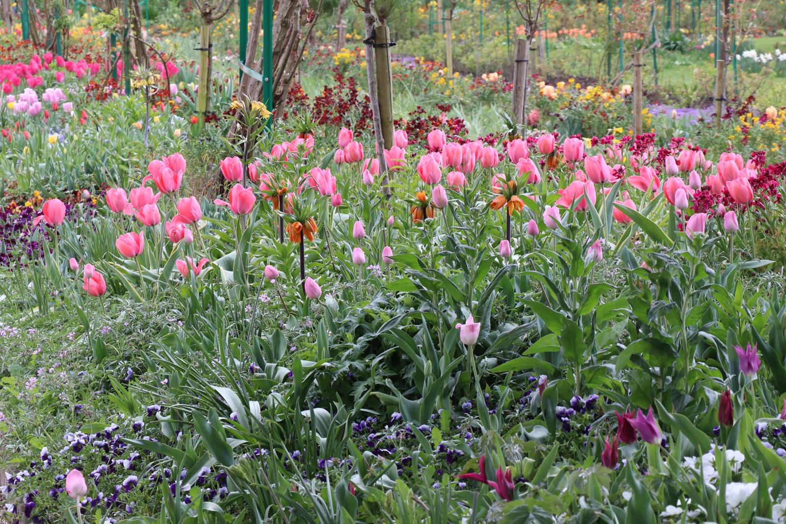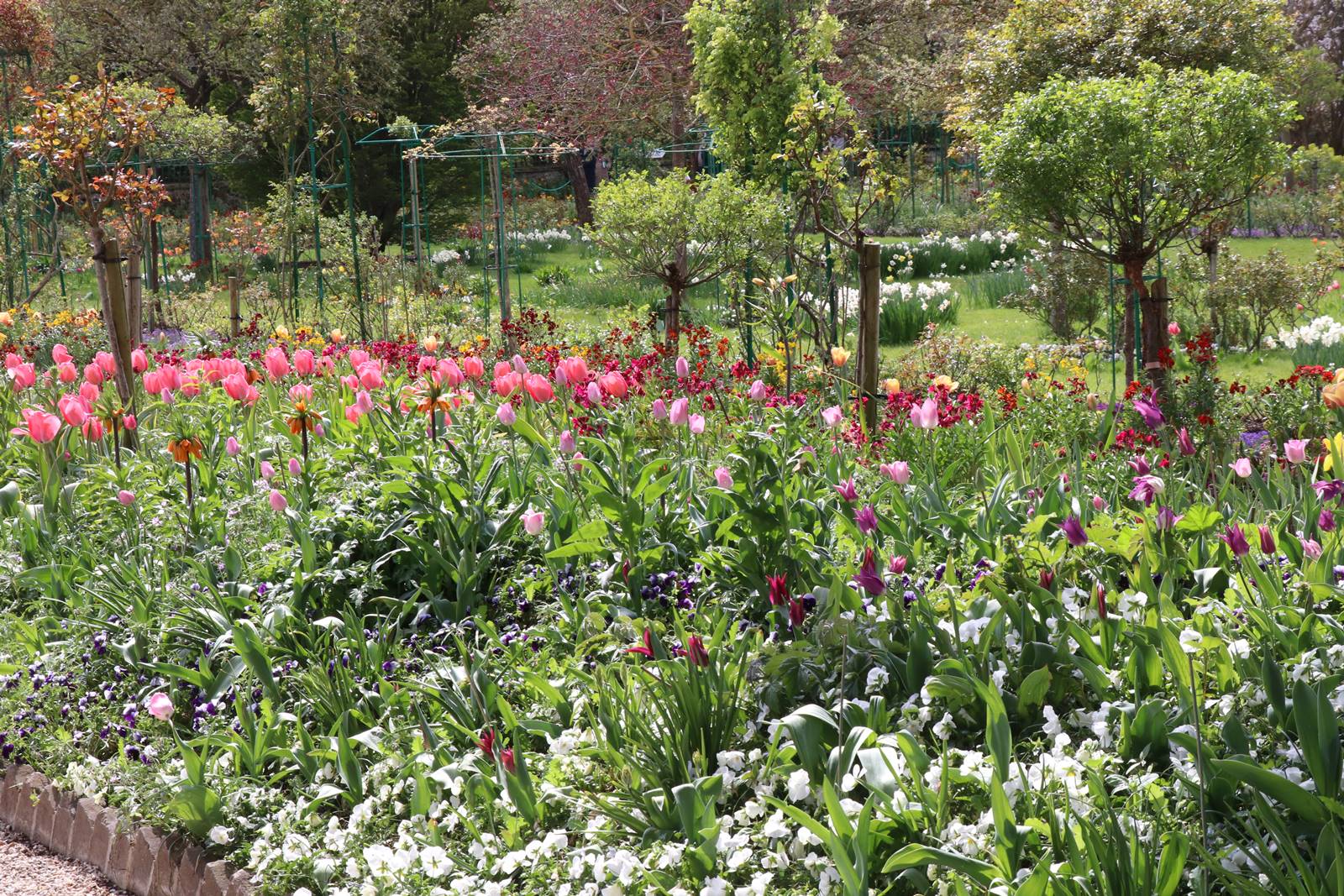 Le sol disparaît sous une profusion de fleurs, jacinthes, pensées, myosotis, primevères, tulipes, fritillaires, narcisses, pâquerettes, giroflées Ersynum cheiri et Aubretia aux coloris multiples. Les floraisons sont rehaussées au mois de mai par la monnaie du Pape Lunaria annua, la julienne des dames Hesperis matronalis qui sont repiquées avec les oeillets de poète. Les clématites montana prennent de la hauteur tandis que fleurissent une multitude de coquelicots Papaver rhoeas et de pavots Papaver somniferum et bien sur, les fameuses allées d’iris que Monet aimait particulièrement et qu’il plantait en longues et larges rangées.