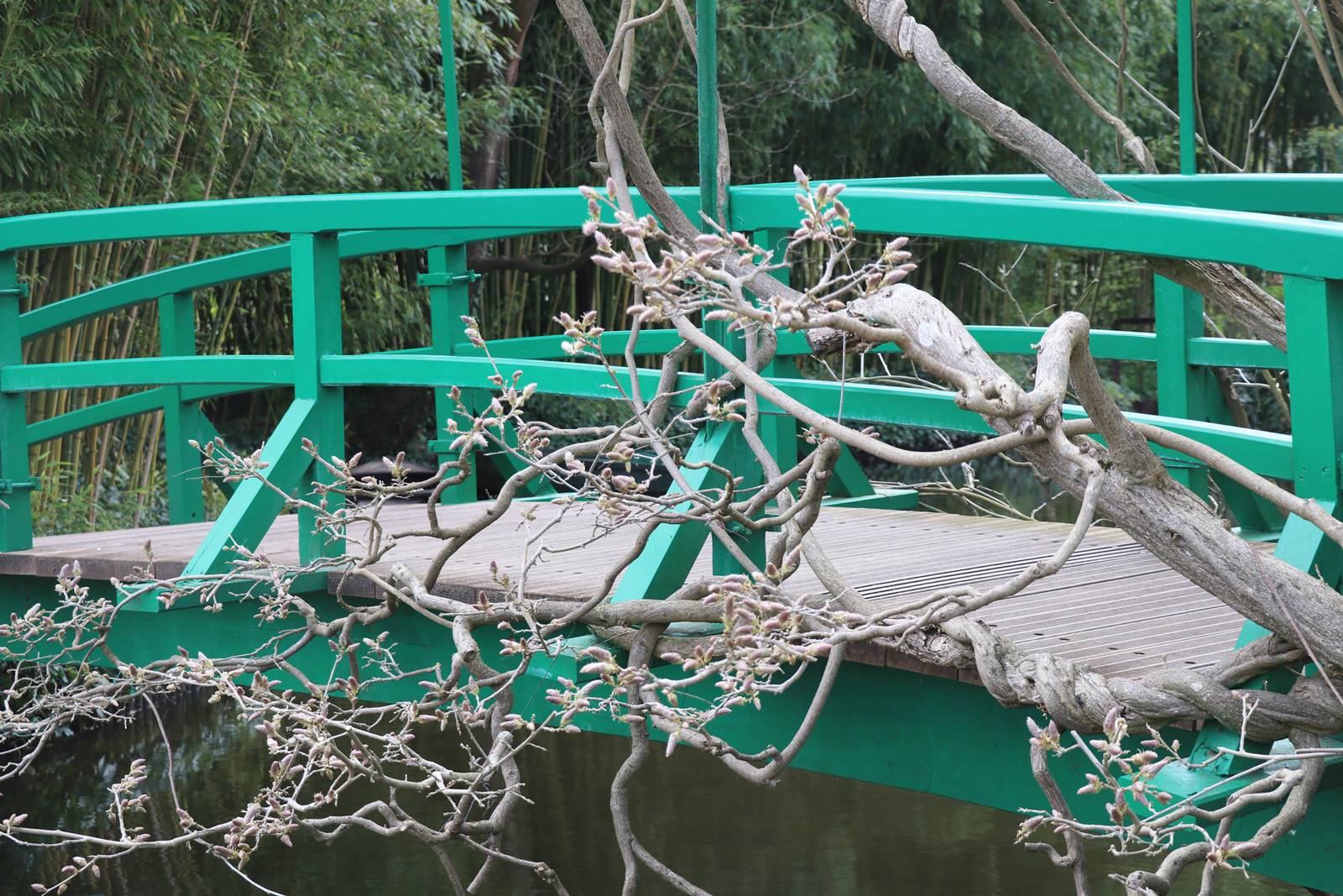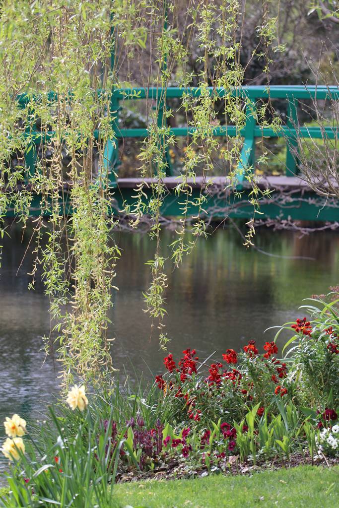 Deux glycines entrelacent un petit pont japonisant certainement inspiré d’une de ses estampes. Monet le peint en vert pour se démarquer du rouge traditionnellement utilisé au Japon. L’atmosphère orientale est restituée par le choix de végétaux tels que les bambous, les ginkgos biloba, les iris du Japon, les somptueuses pivoines arbustives, les lis et les saules de Babylone aux rameaux dorés qui encadrent merveilleusement l’étang.