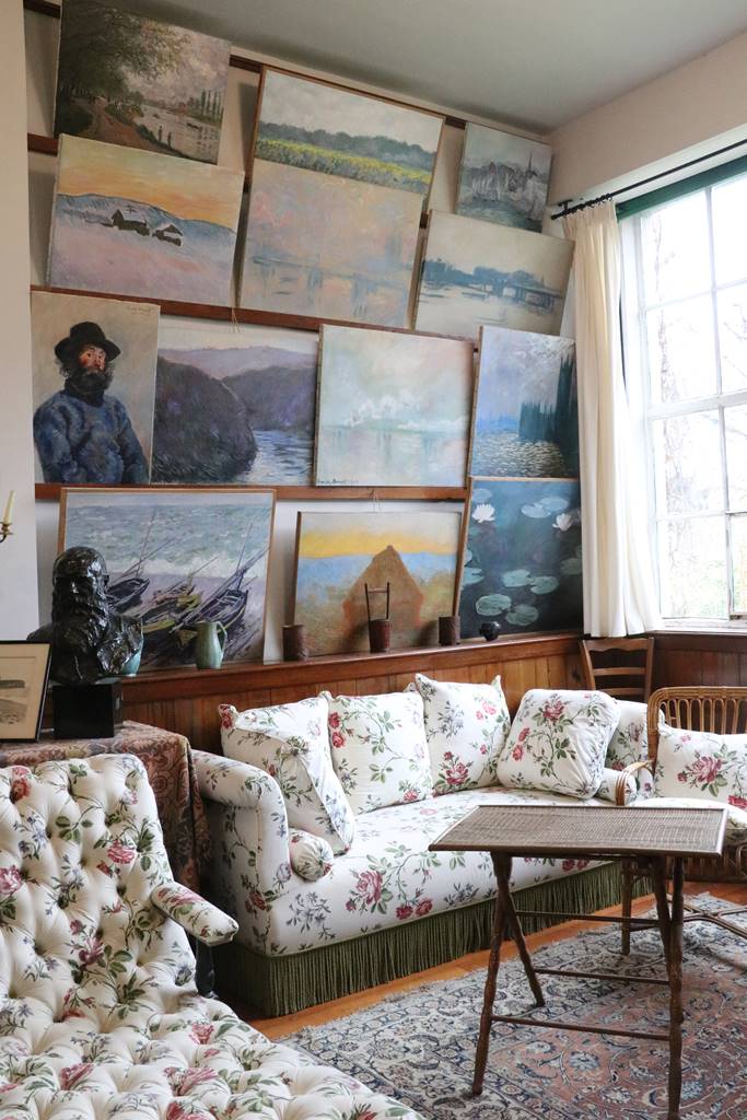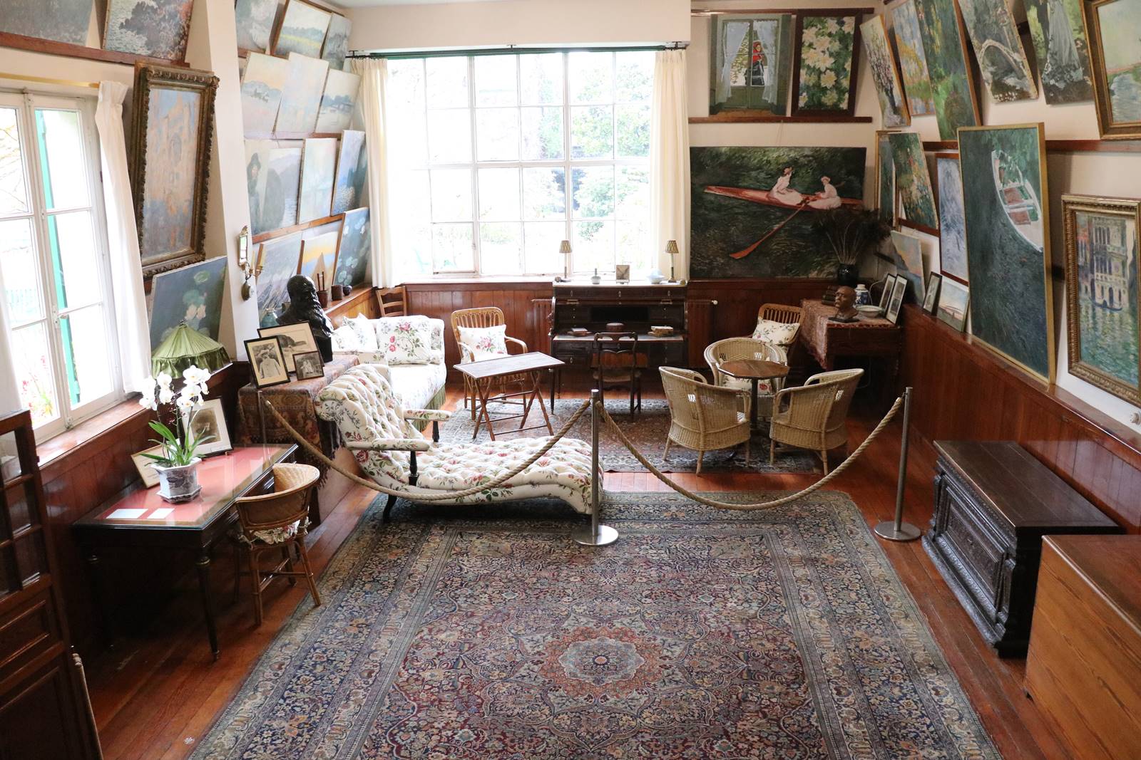 Aux murs, sur trois rangs, Claude Monet accrochait ses toiles conservées aujourd’hui au musée Marmottan, au musée d’Orsay ou dans d’autres grands musées du monde. Des répliques sont présentées aux cimaises du salon-atelier selon un accrochage dense afin de retrouver l’atmosphère d’antan, dans le souci du grand respect de la vérité historique.