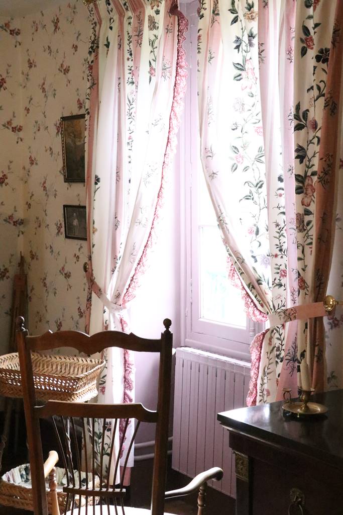 La visite se poursuit par le cabinet de toilette et la chambre d’Alice Monet qui donne sur une minuscule pièce destinée aux travaux de couture. Des nappes damassées cousues ensemble tapissent les murs des deux chambres.