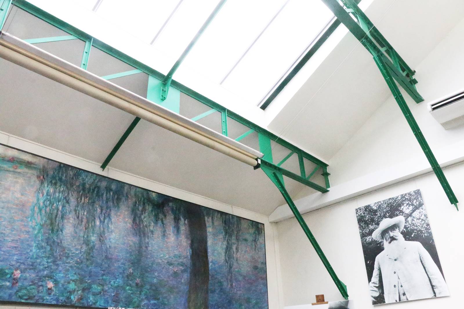 L’atelier des nymphéas est construit par Monet en 1915 en haut du jardin afin de pouvoir peindre avec une bonne lumière les grandes «Décorations des Nymphéas». Cette série de huit toiles monumentales que le maître a offert à la France en 1918 est aujourd’hui exposée au musée de l’Orangerie dans le Jardin des Tuileries à Paris. Les murs de l’atelier de Giverny sont ornés de reproductions évoquant à merveille cette oeuvre majeure de la première moitié du 20e siècle. L’atelier sert aujourd’hui de boutique librairie pour l’accueil des visiteurs.