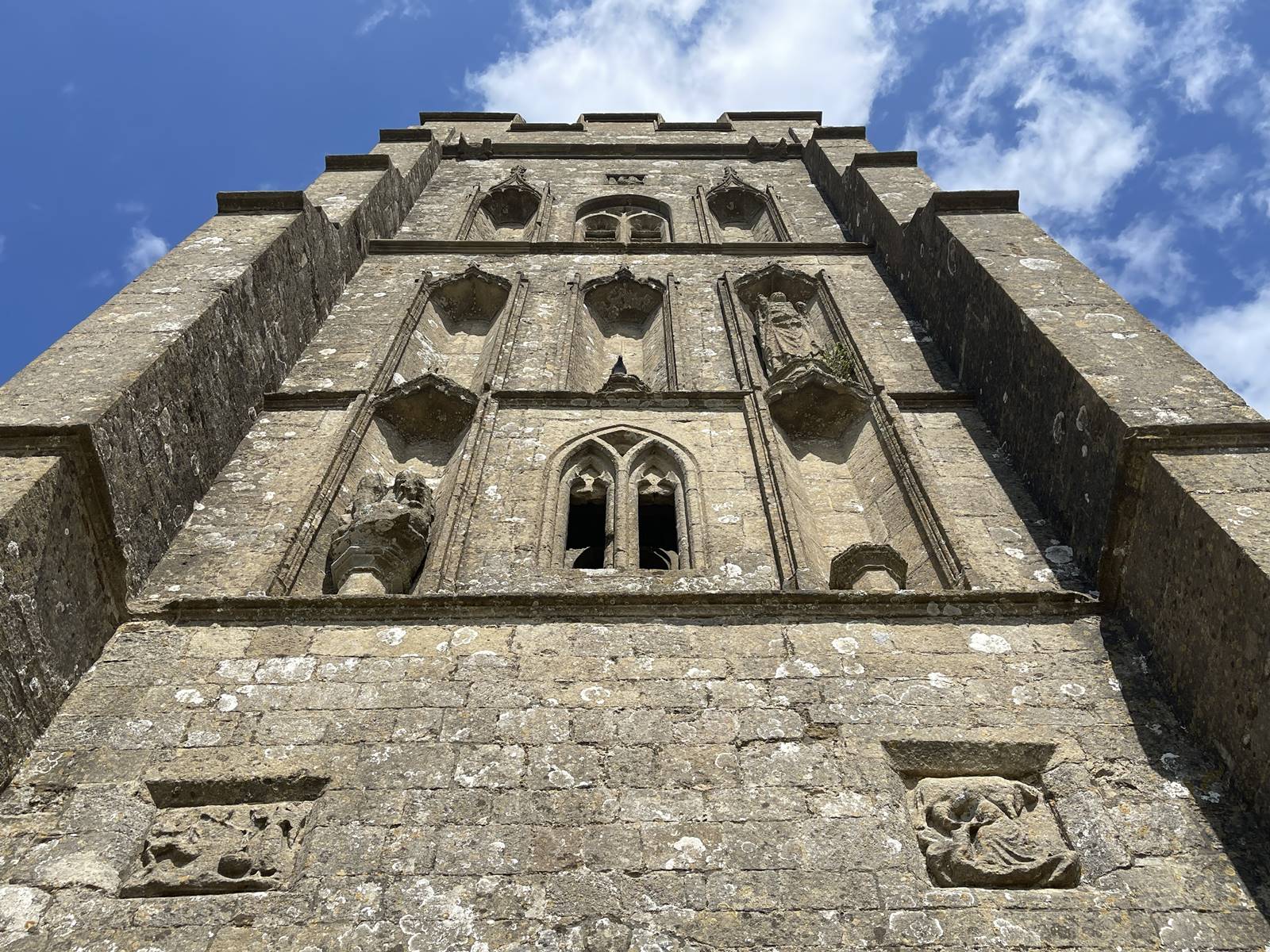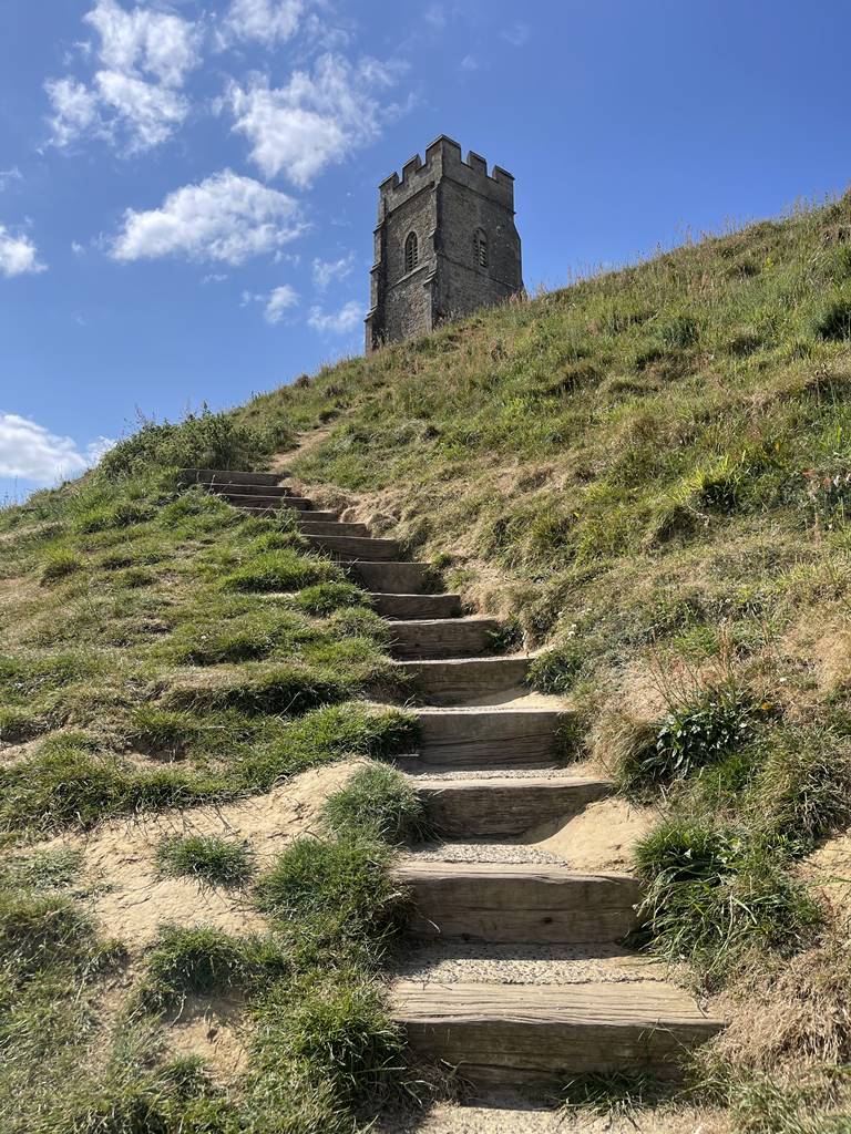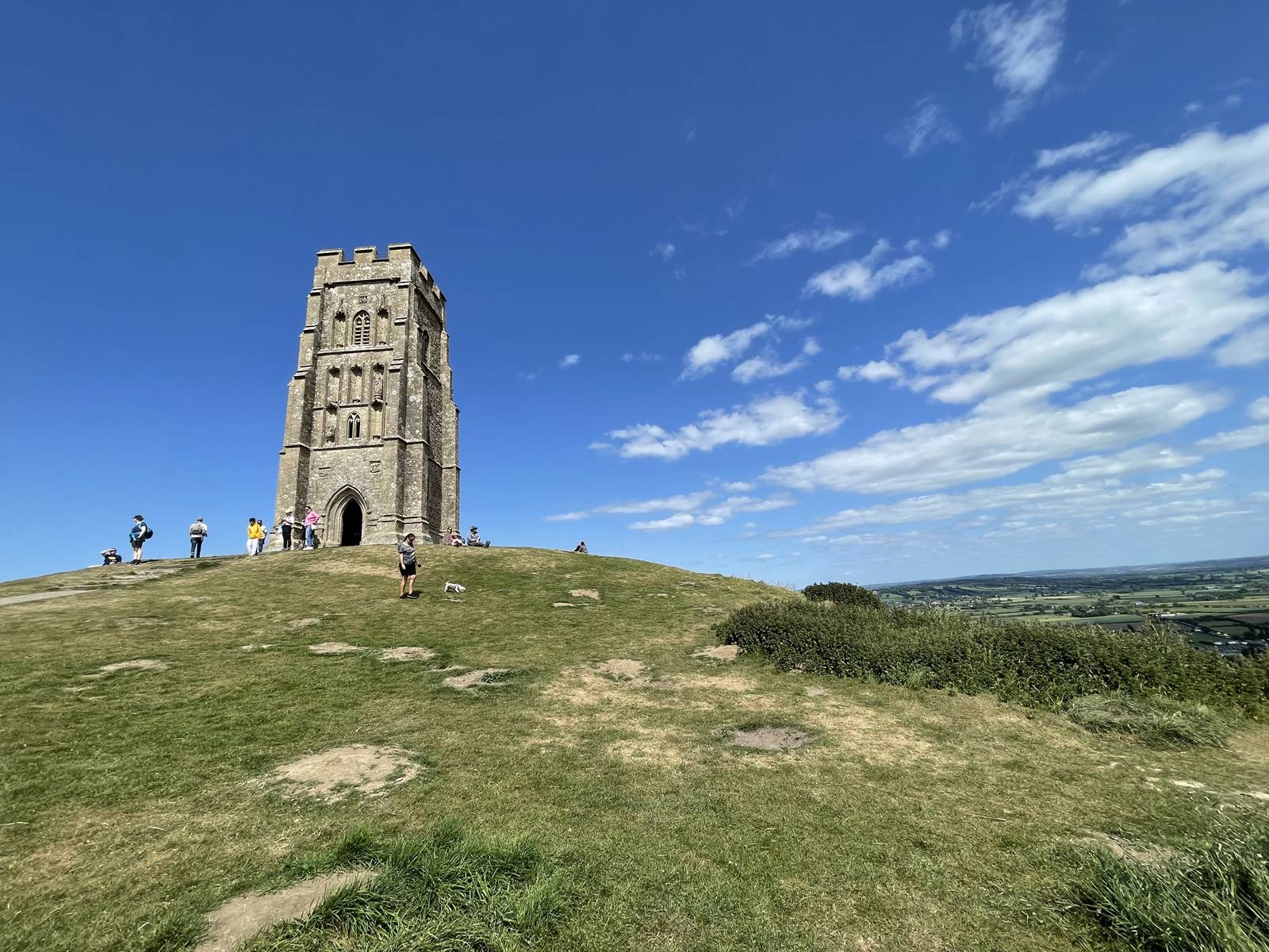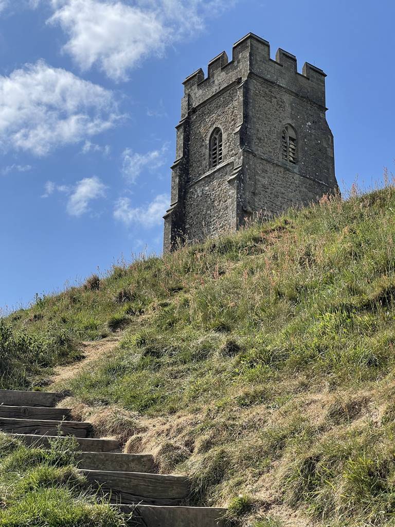 Après une grimpette à pied d’un quart d’heure à une demi heure selon sa forme physique, on atteint le sommet du Glastonbury Tor où se dresse une tour massive, édifice emblématique de la région. Une église en bois dédiée à Saint Michel bordée de cellules de moines fut construite au sommet de la colline vers le 10e ou le11e siècle. En 1275, un tremblement de terre détruit cette église qui est remplacée par une seconde église en grès local, dépendance de l’abbaye de Glastonbury. L’église reste en place jusqu’à la dissolution des monastères en 1539. Le dernier abbé de l’abbaye, Richard Whiting, y fut pendu, écartelé et dépecé avec deux de ses moines en 1539. Le monastère fut démoli pour en extraire la pierre. Seule la tour massive subsiste aujourd’hui.