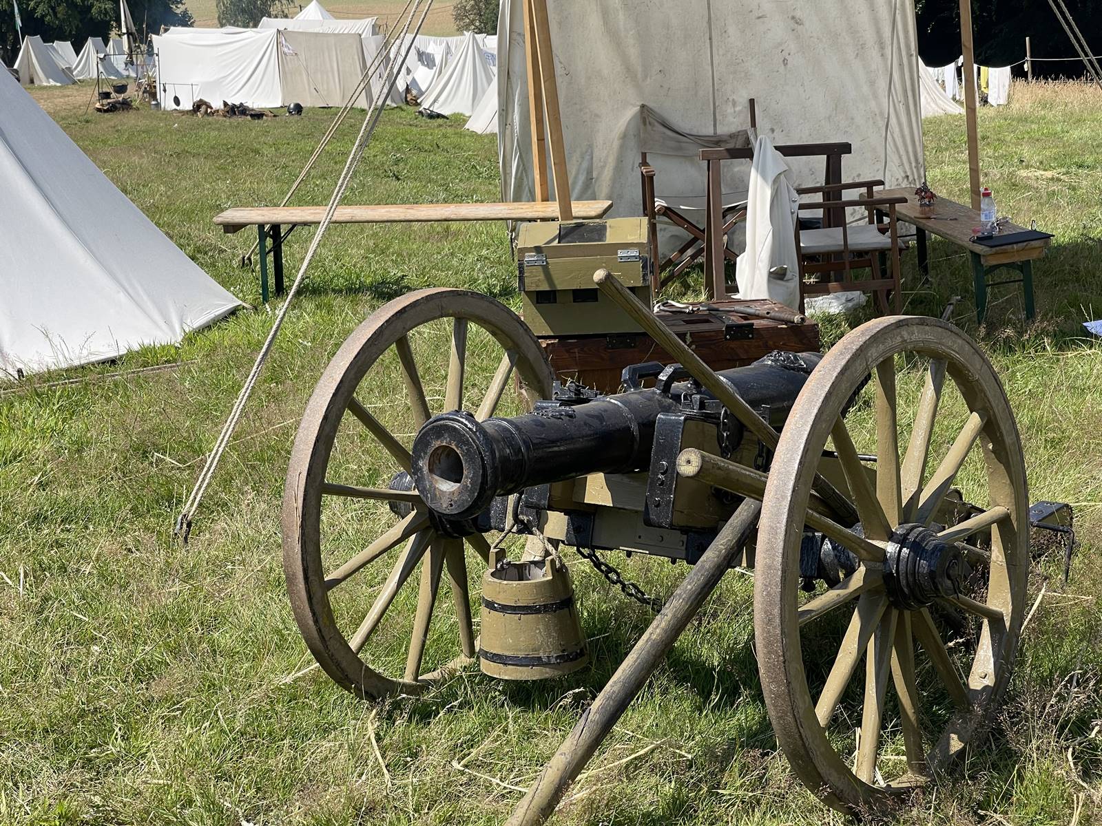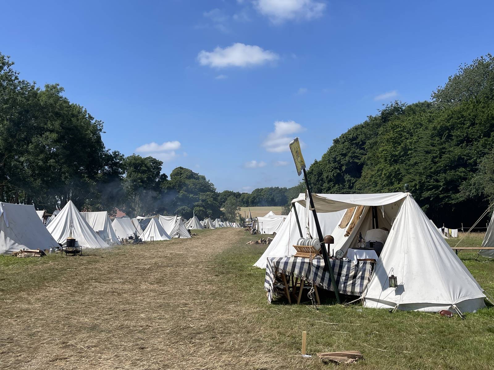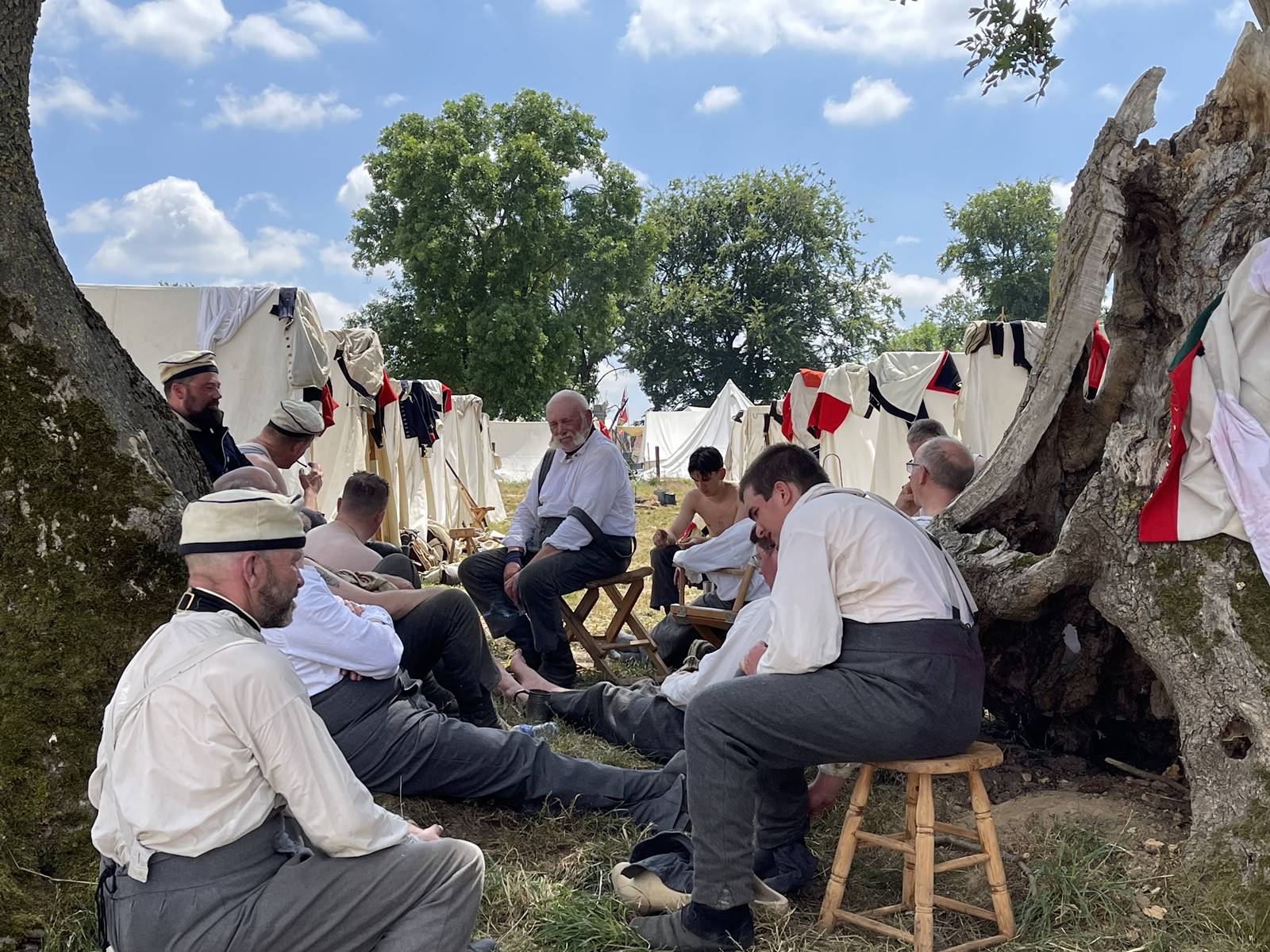 Des centaines de tentes en tissu blanc sont alignées dans l’ancien verger de la ferme d’Hougoumont. Les reconstitueurs, soldats, officiers ou vivandières, dorment là sans beaucoup de confort. Le matelas fait de paille est posé sur le sol. A côté est posé le sac du soldat, son arme et tout son attirail ainsi que le matériel pour vivre et cuisiner.